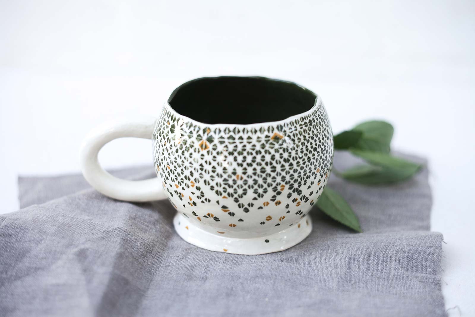 Большая керамическая чашка для чая. Вылеплена вручную из белой глины и декорирована росписью. Чашку можно мыть в посудомоечной машине и разогревать в микроволновой печи.