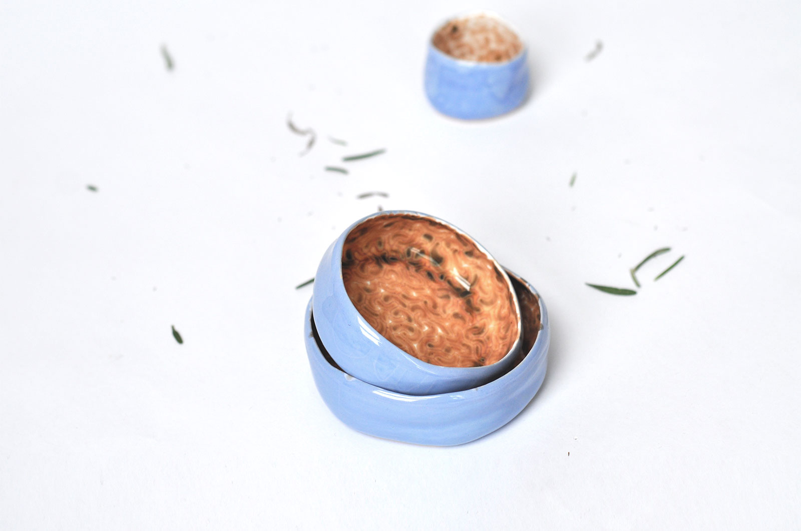 Большие керамические пиалы для еды из коллекции посуды «Дежавю». Вылеплены вручную из белой глины и декорированы росписью внутри. Можно использовать для подачи орехов и сухофруктов. Пиалу можно мыть в посудомоечной машине и разогревать в микроволновой печи.
