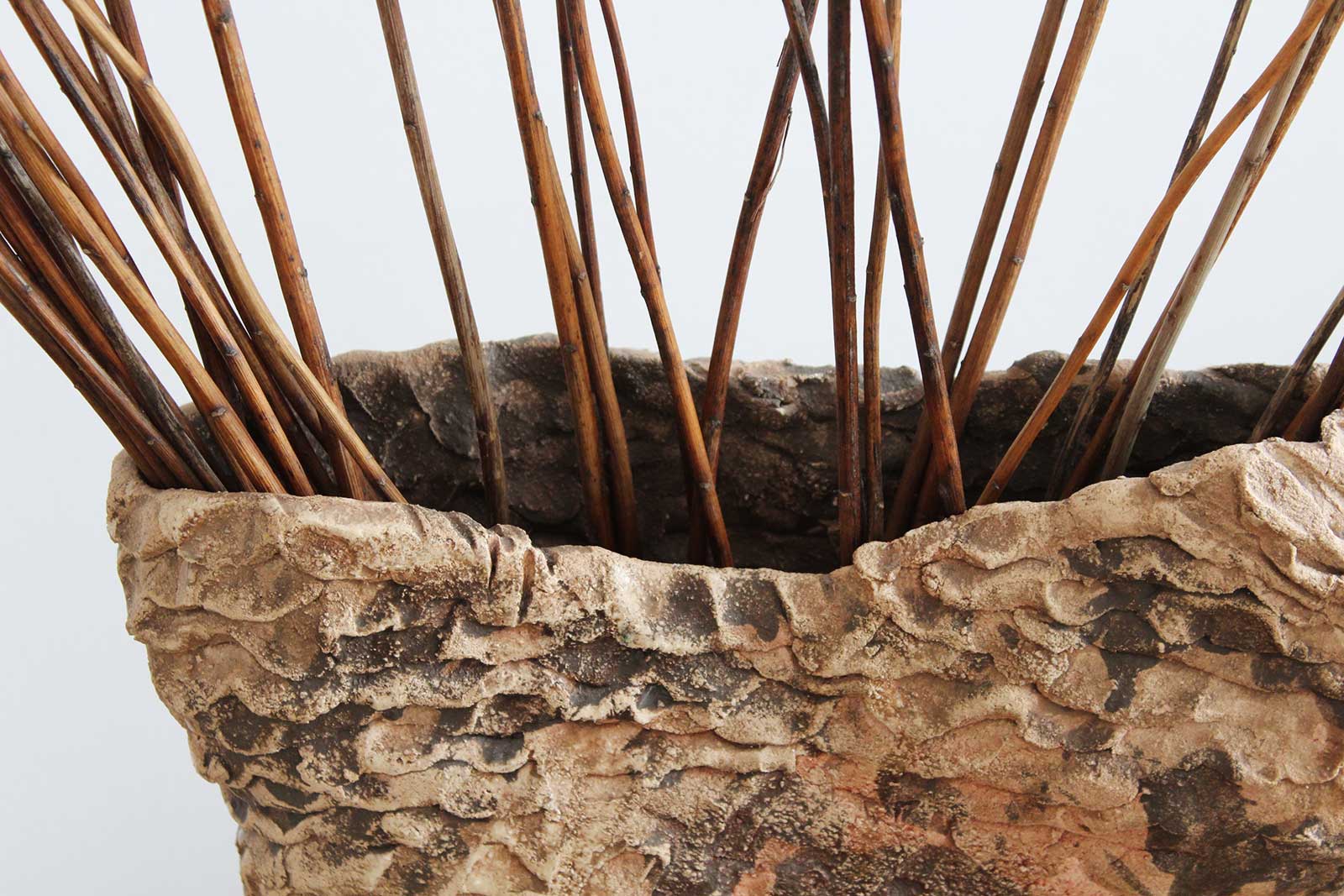 Большая декоративная ваза. Вылеплена вручную из шамотной глины и декорирована рельефной фактурой. Можно использовать как самостоятельный декор для украшения интерьера или как вазу для сухоцветов.