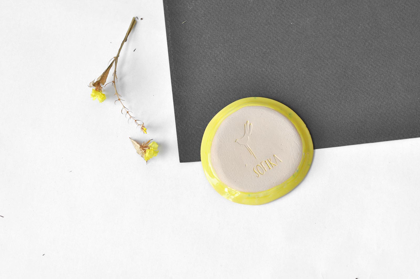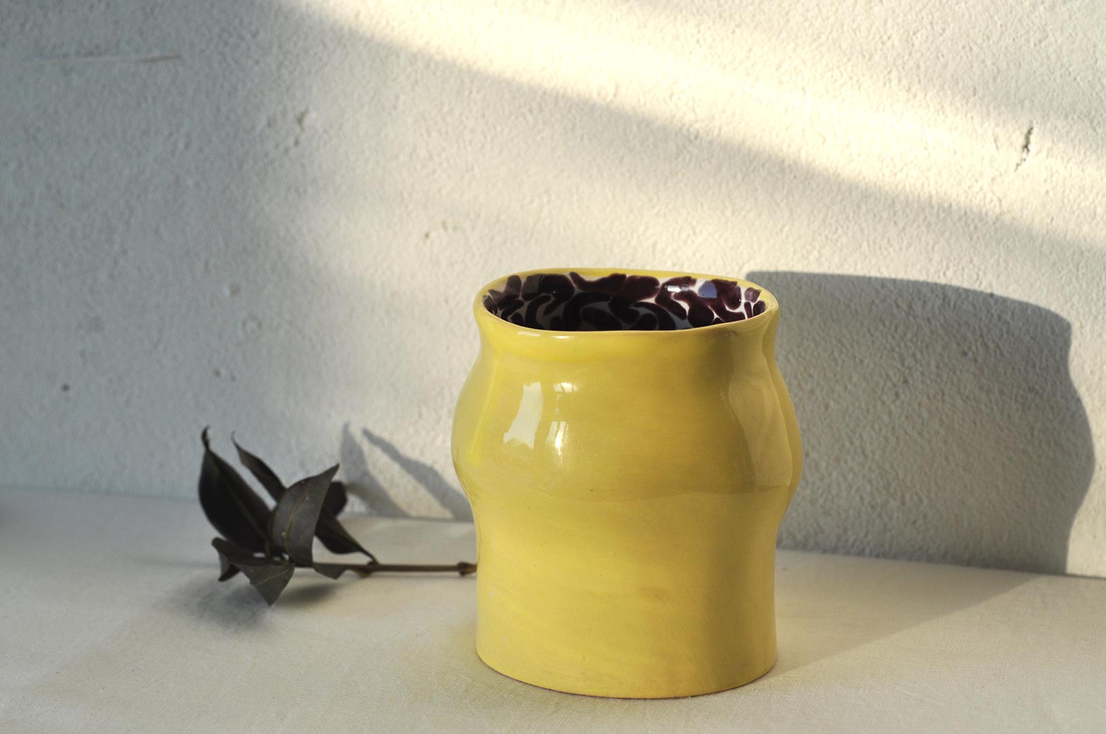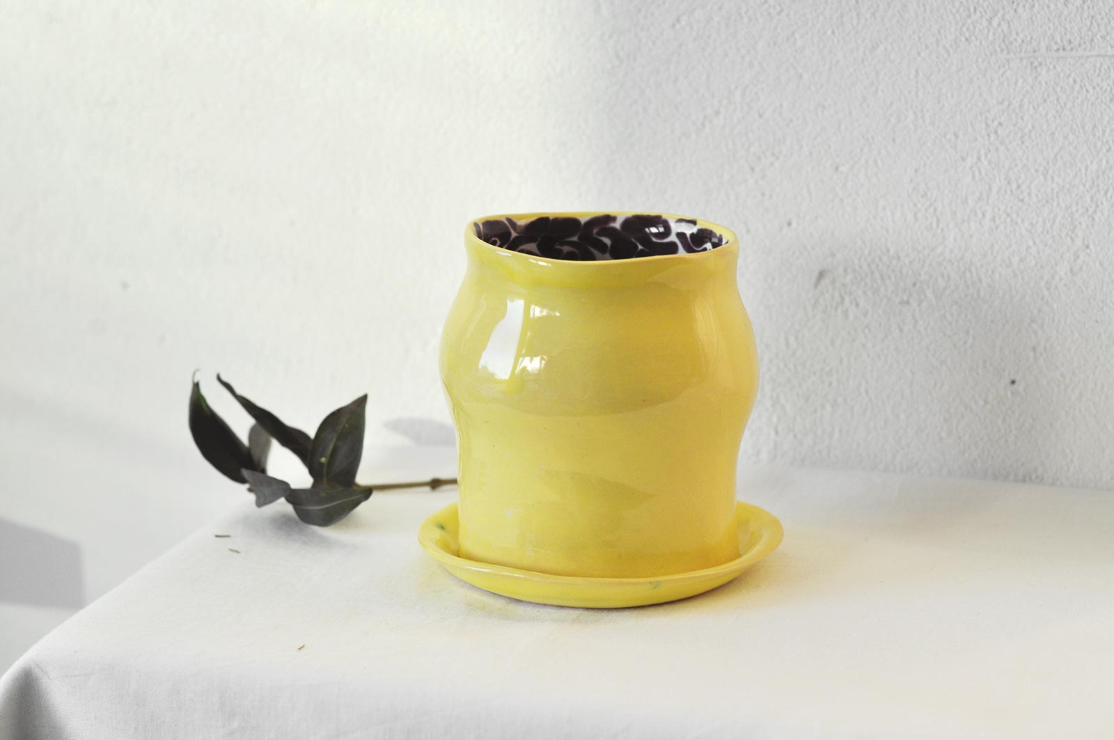 Керамические стаканы с блюдцем из набора для кофе «Лимоновый пирог». Вылеплены вручную из белой глины и декорированы росписью внутри. Изделия можно мыть в посудомоечной машине и разогревать в микроволновой печи.