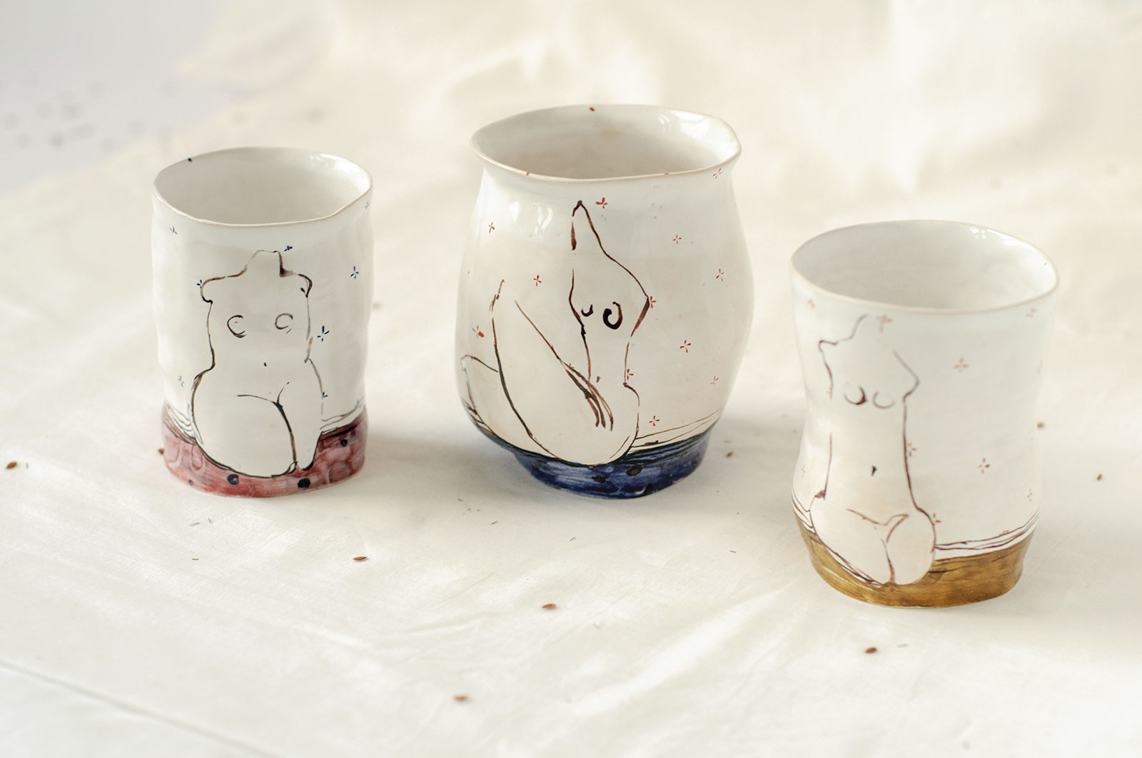 Керамические стаканы из серии «Обнаженные». Изделия вылеплены вручную из белой глины и декорированы подглазурной росписью. Можно использовать как для холодных так и для горячих напитков. Стаканы можно мыть в посудомоечной машине и разогревать в микроволновой печи.