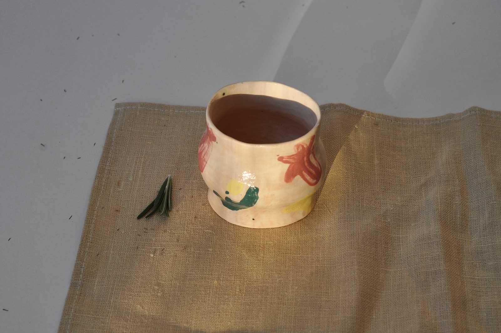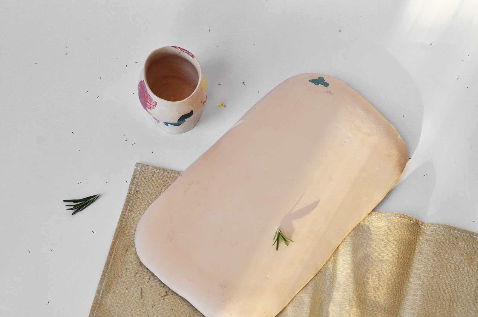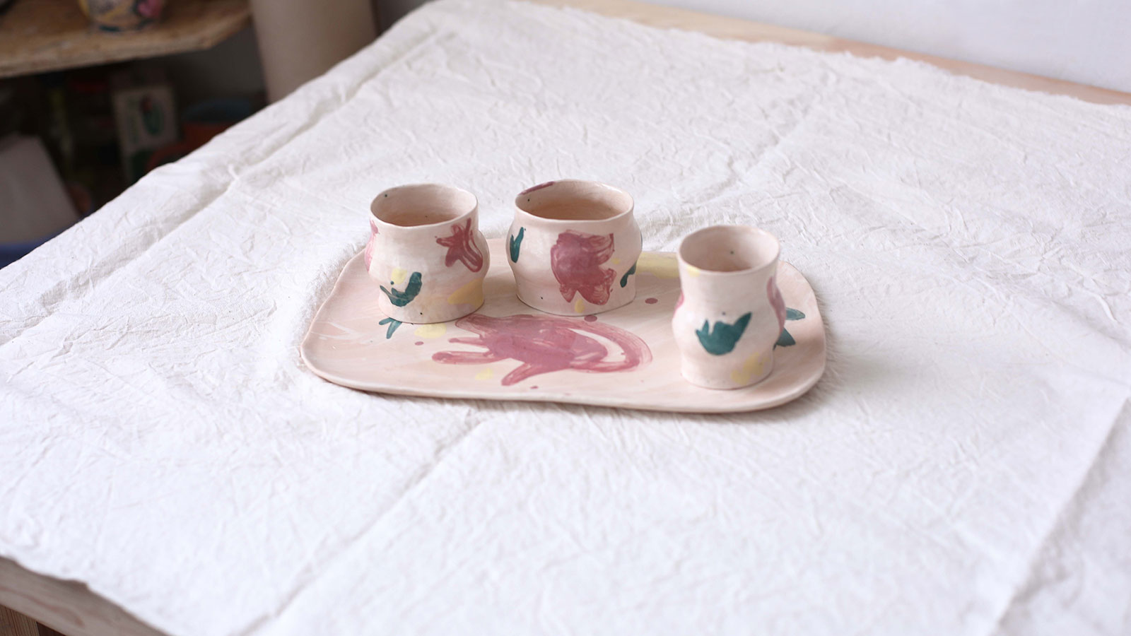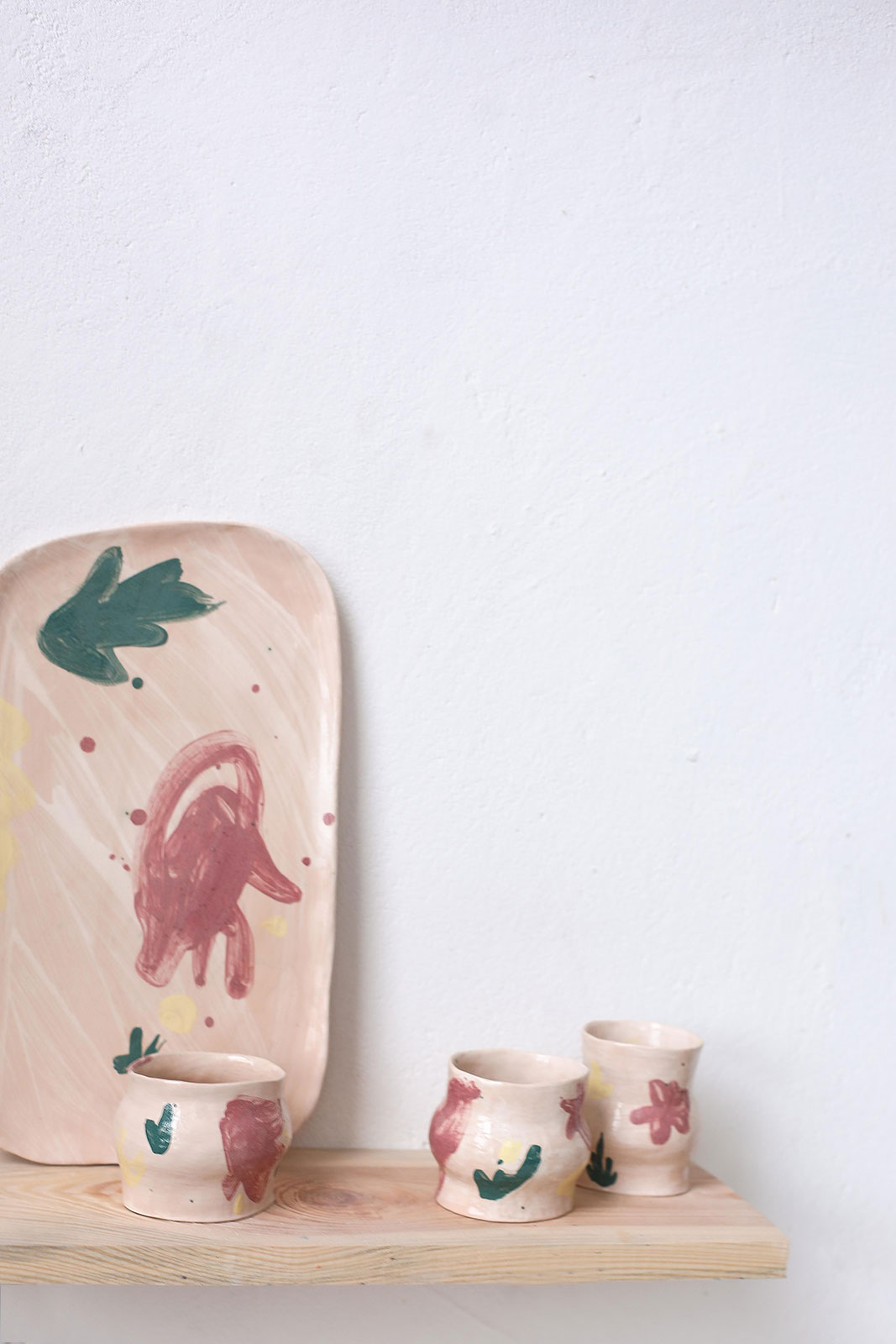 Стаканы и тарелка из набора «Непринужденность №2». Вылеплены вручную из белой глины и декорирован ангобной росписью. Можно использовать как для холодных так и для горячих напитков. Этот набор прекрасно подойдет под кофе. Изделия можно мыть в посудомоечной машине и разогревать в микроволновой печи.