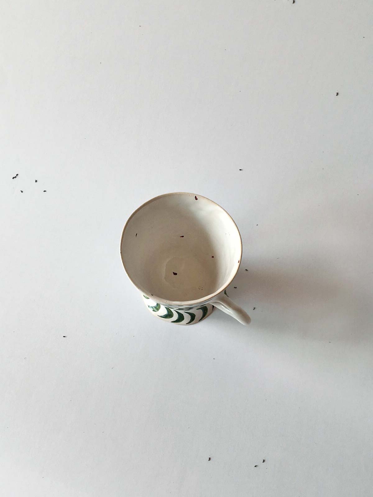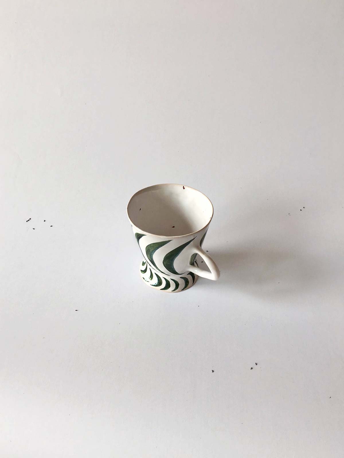 Cup from green pattern, made by hand from white clay and decorated with underglaze painting. Wares can be washed in a dishwasher and heated in a microwave oven.