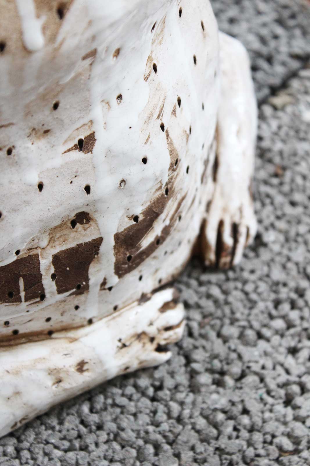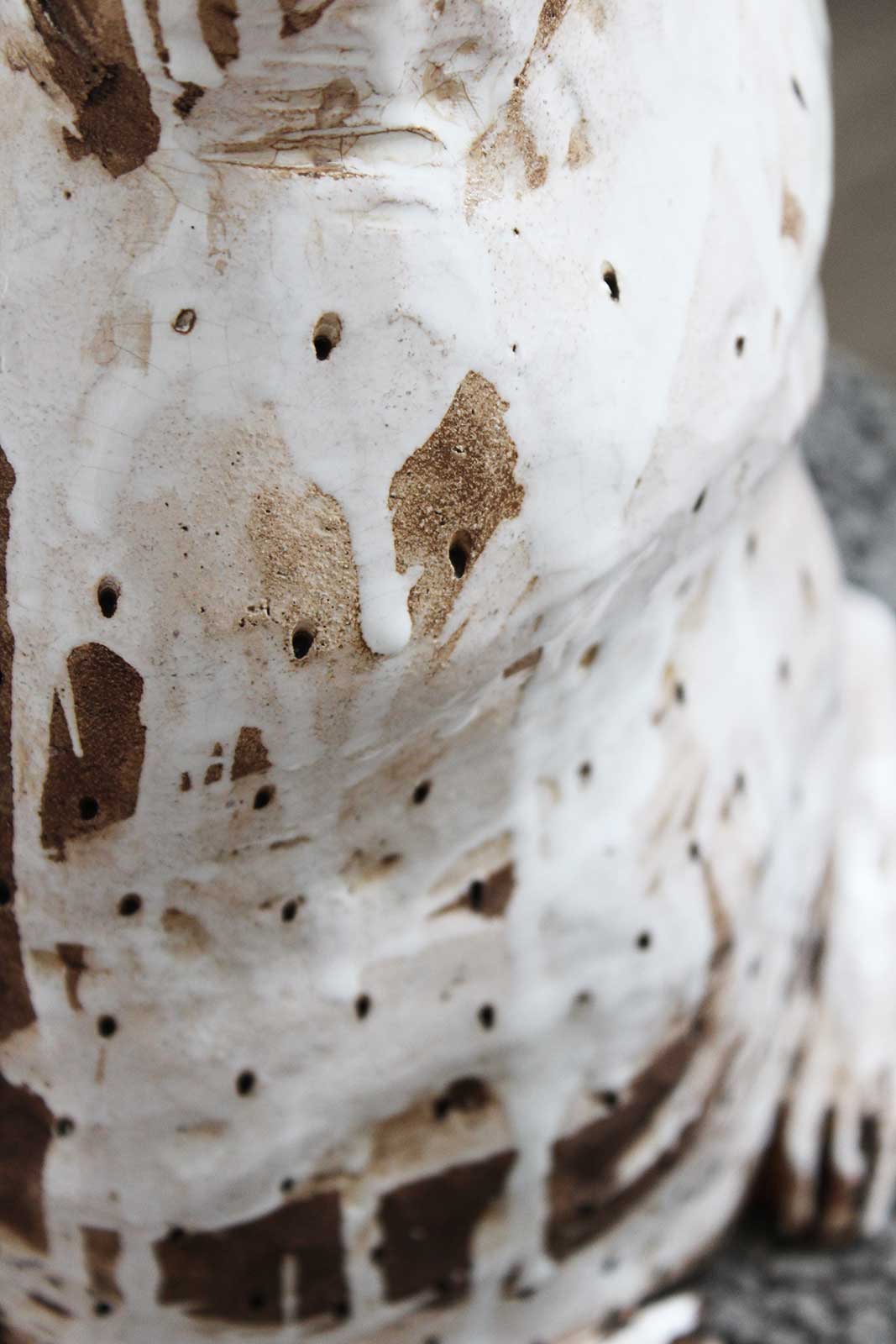 Series from three decorative sculptures “Gossip“. Sculptures made by hand from chamotte clay and decorated with texture and smoke.