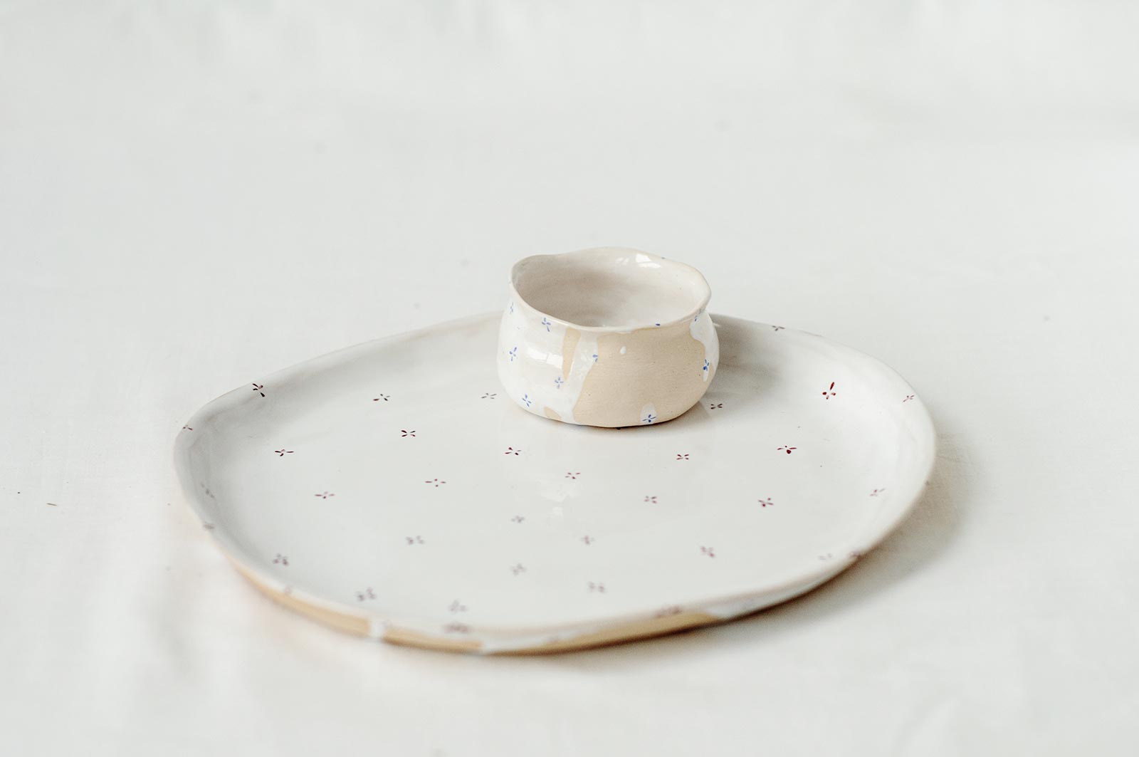 Flat ceramic plates for food from collection “Flowers with milk“. Made by hand from white clay and decorated with underglaze painting. Can be used as a snack plate or side dishes. The products can be washed in a dishwasher and heated in a microwave oven.