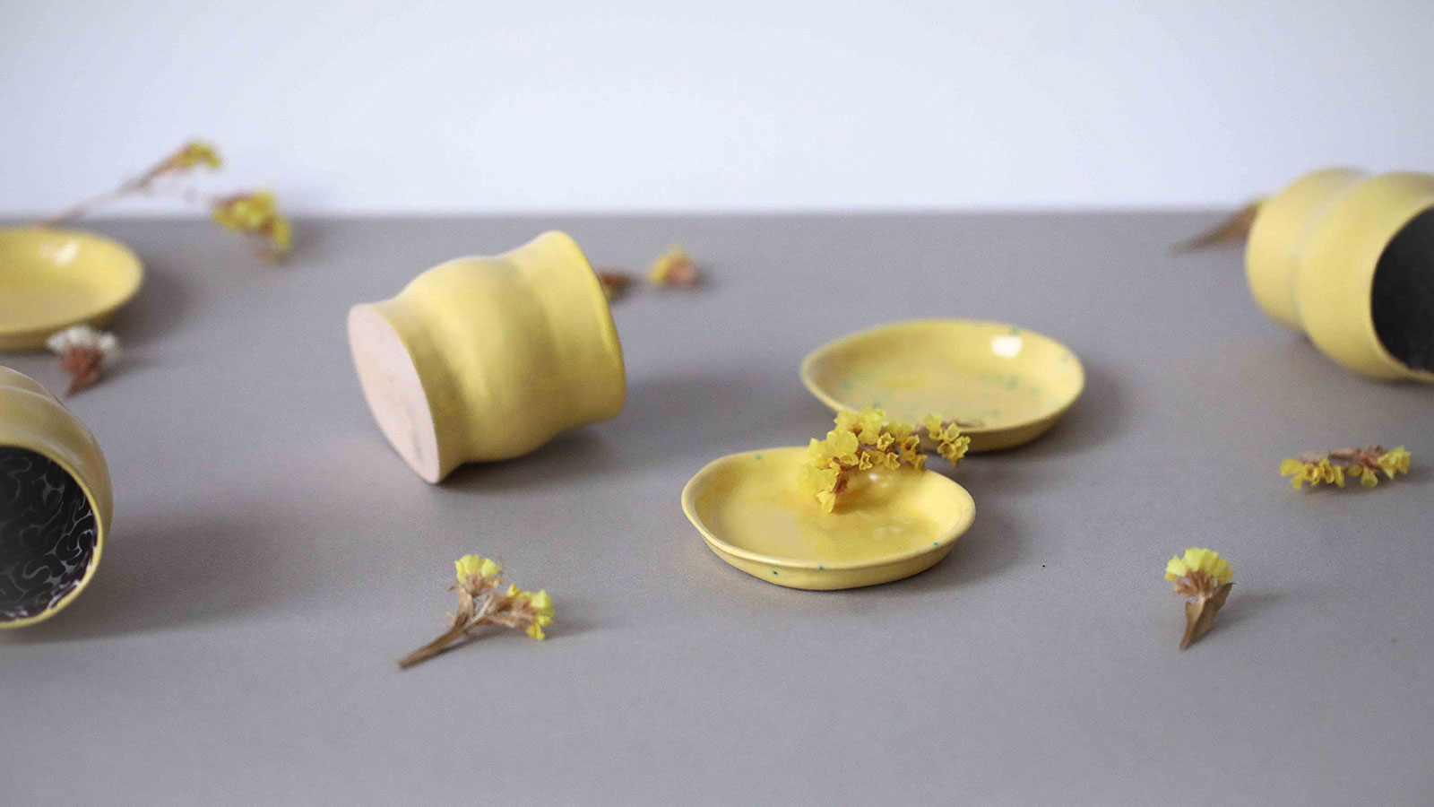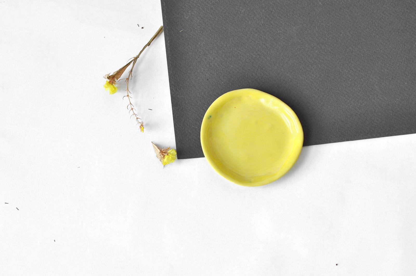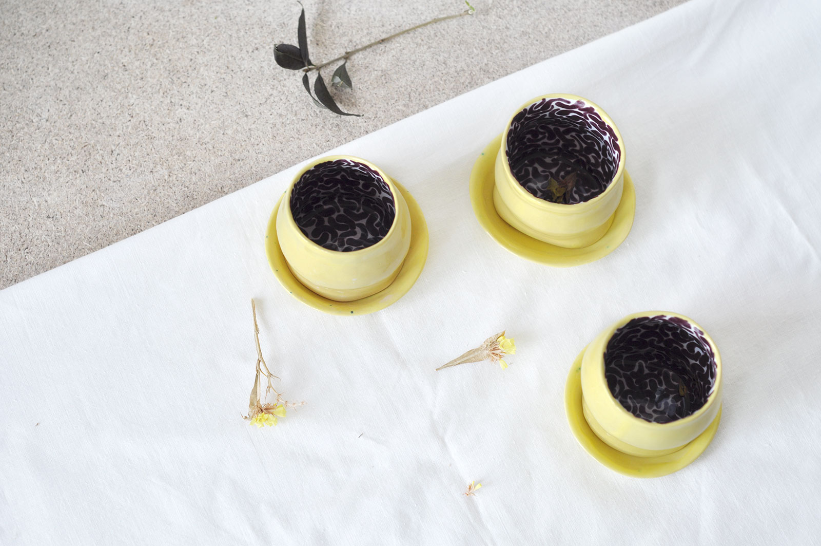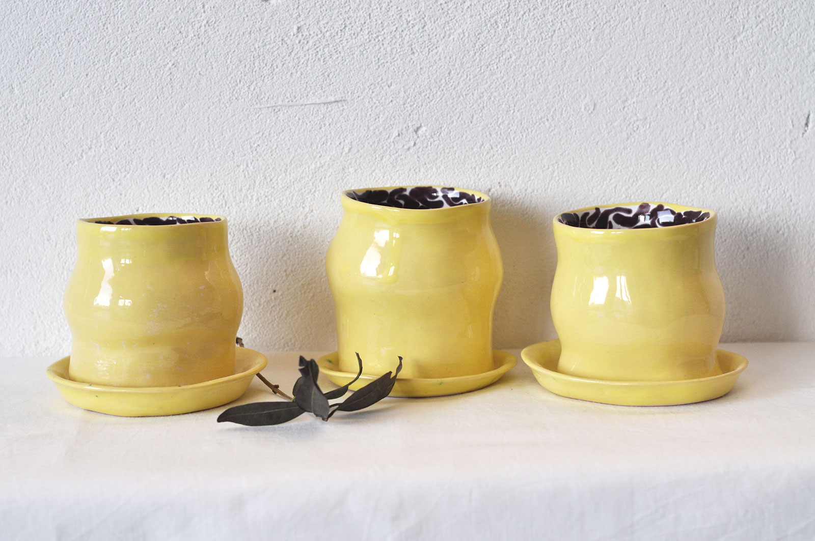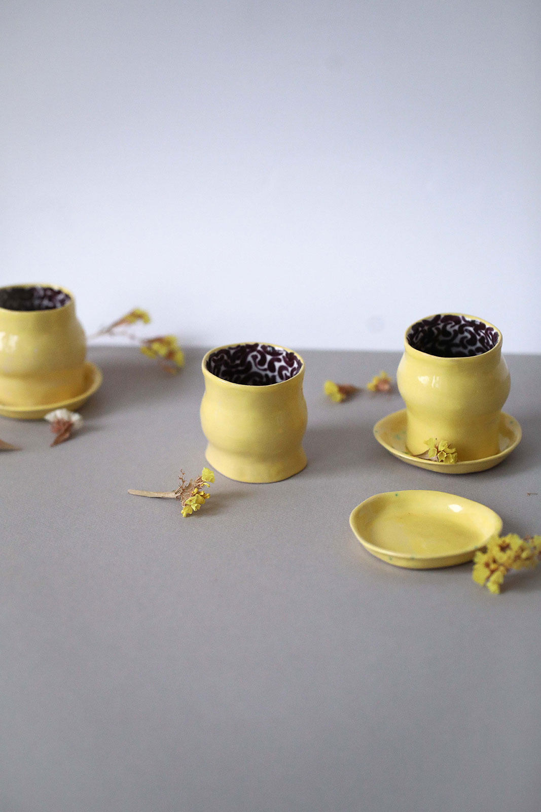 Ceramic glasses with saucer from set for coffee”Lemon Cake“. Made by hand from white clay and decorated with painted inside. The products can be washed in a dishwasher and heated in a microwave oven.