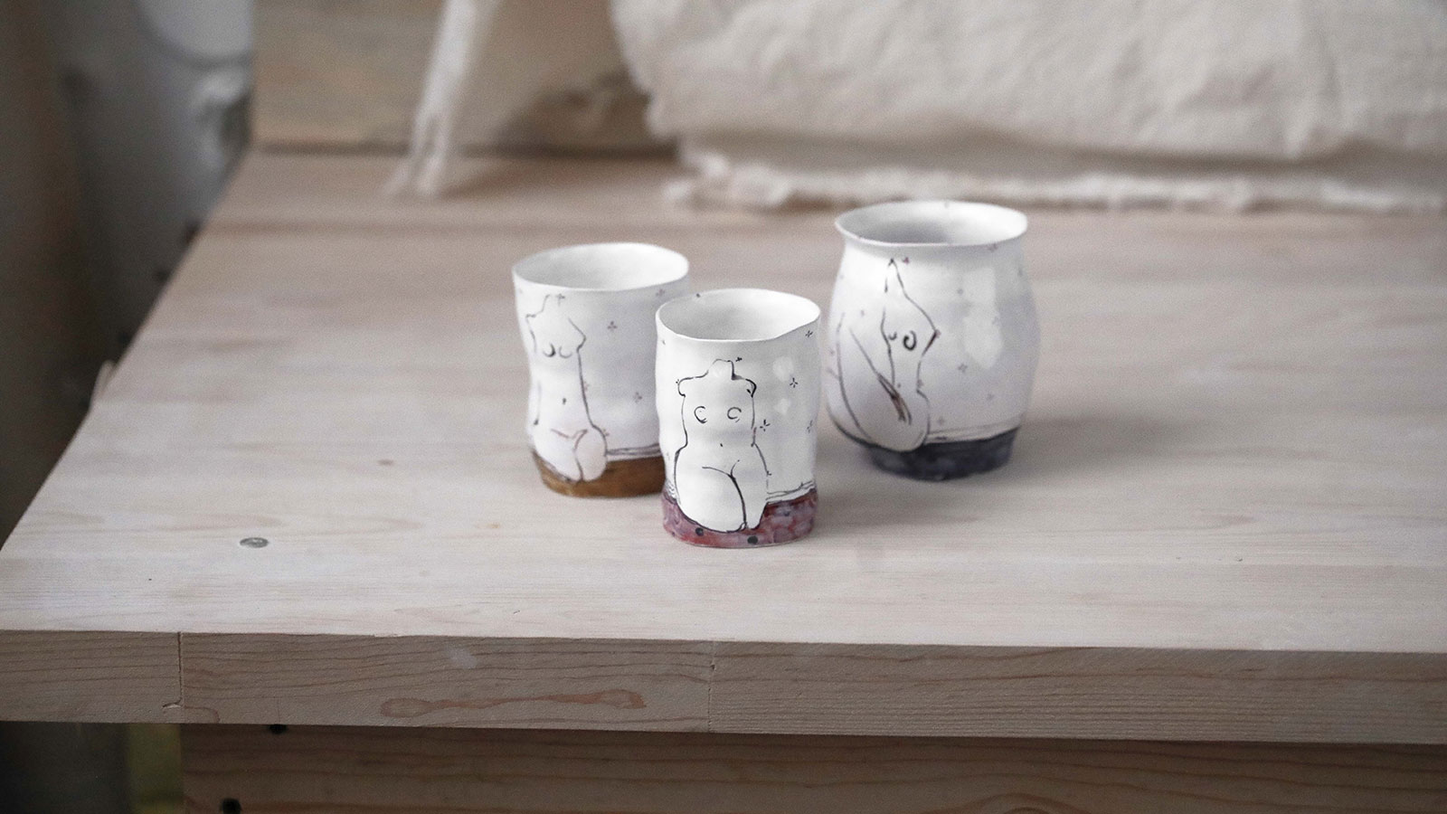 Ceramic glasses from the series “Naked“. Wares made by hand from white clay and decorated with underglaze painting. Can be used for both cold and hot drinks. Glasses can be washed in a dishwasher and heated in a microwave oven.