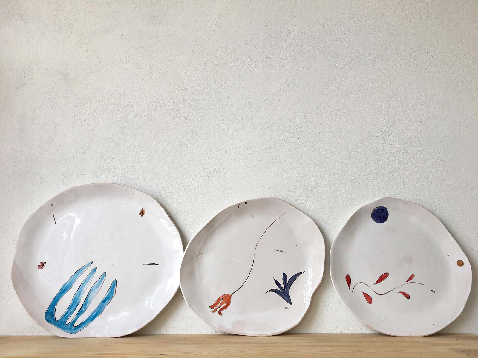 Large round plate”Composition No. 4″, made by hand from white clay and decorated with underglaze painting. Will become a good decoration of the interior or a wonderful plate for eating. Wares can be washed in a dishwasher and heated in a microwave oven.