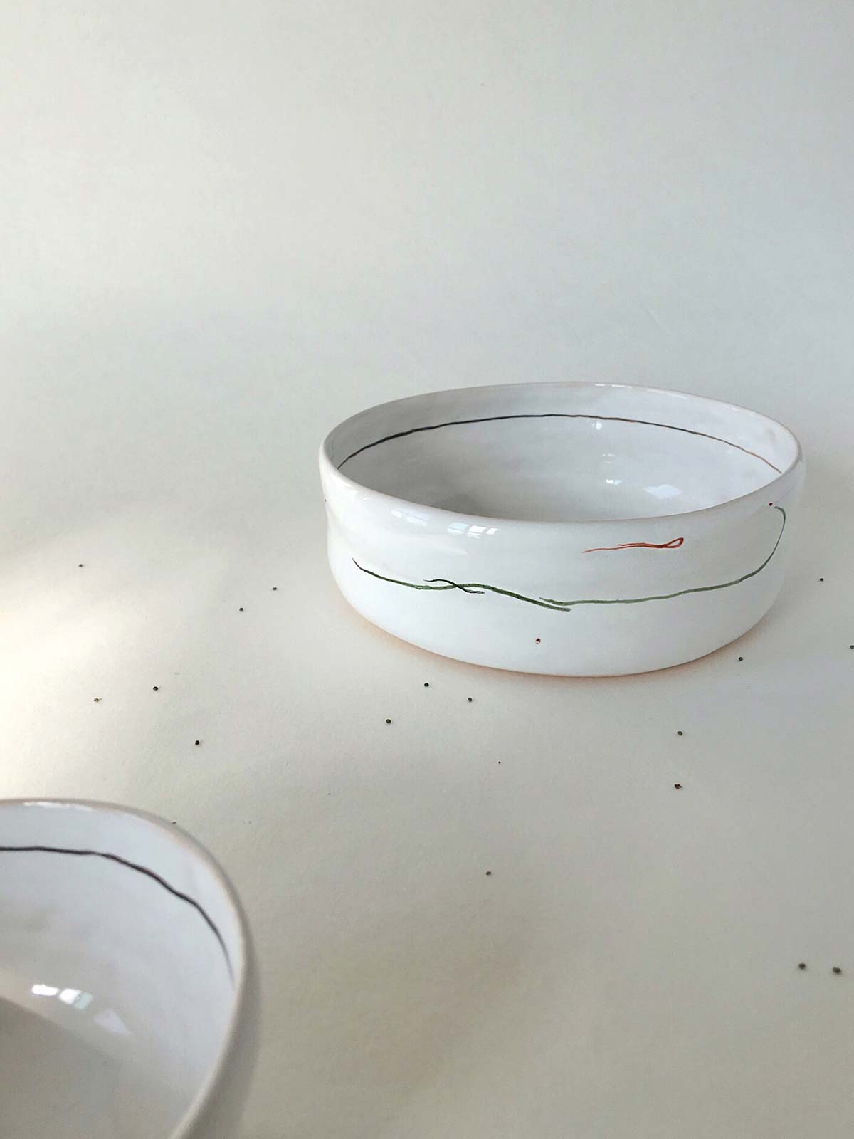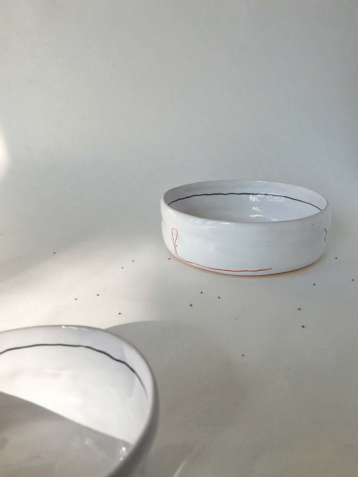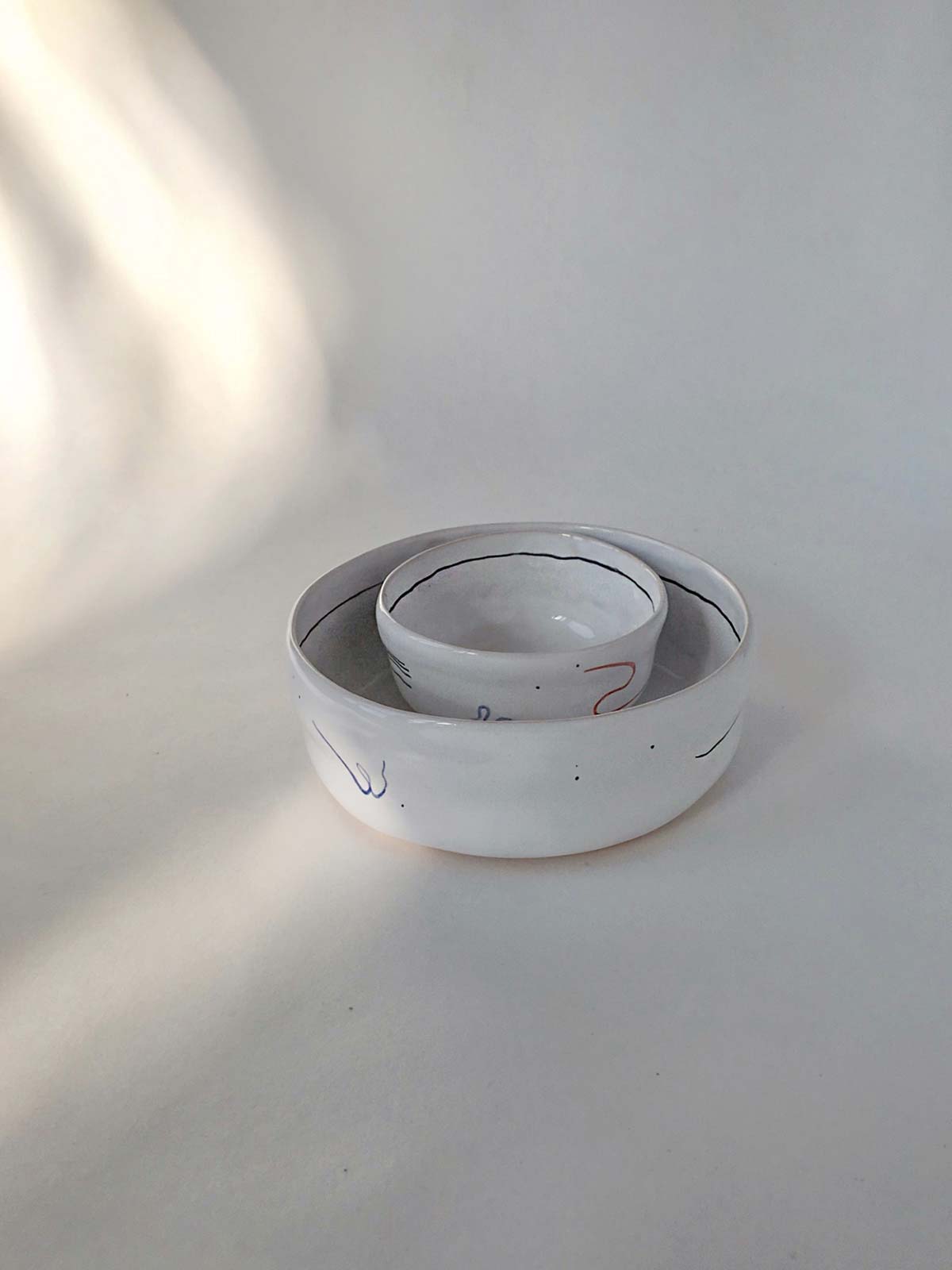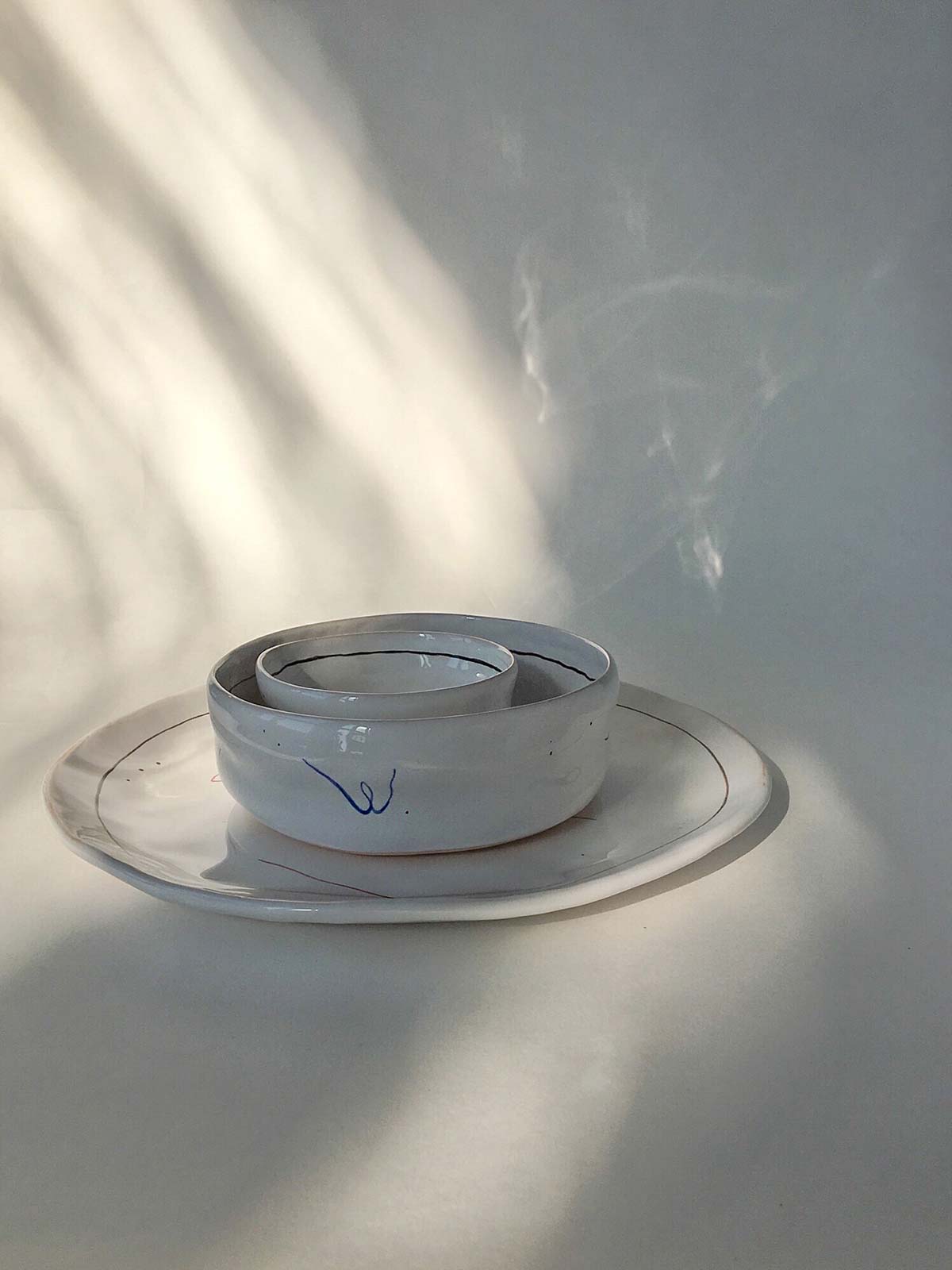 Set plates with abstract drawing, consists from flat, deep plates and pialas. All wares made by hand from white clay and decorated with underglaze painting. The products can be washed in a dishwasher and heated in a microwave oven.