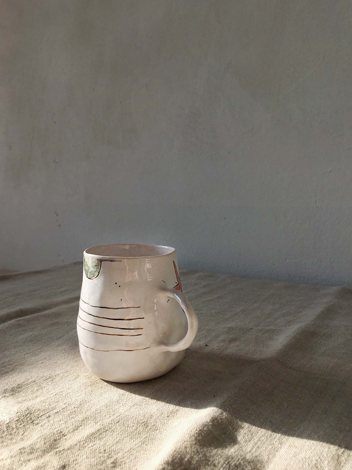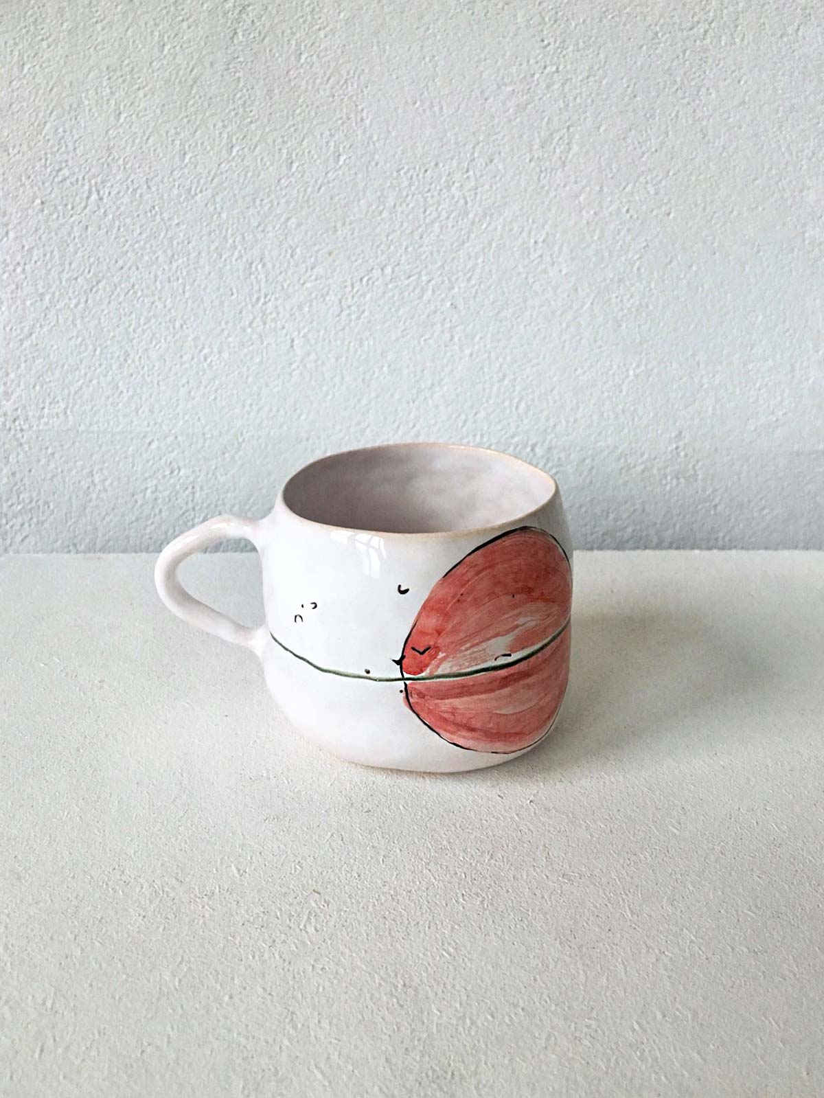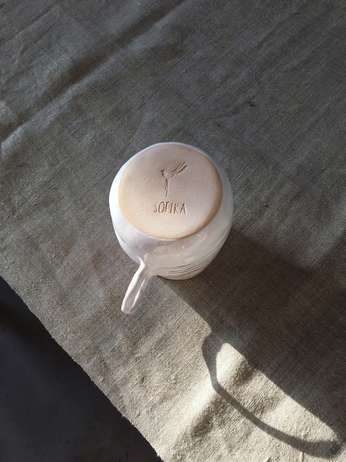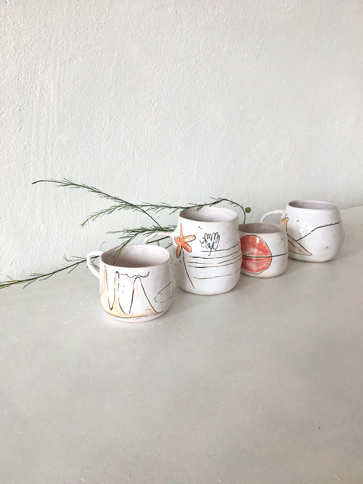 Керамічні чайні та кавові чашки з колекції «Про літо». Вироби виліплені вручну з білої глини і декоровані підглазурним розписом. Чашки можна мити в посудомийній машині і розігрівати в мікрохвильовій печі.