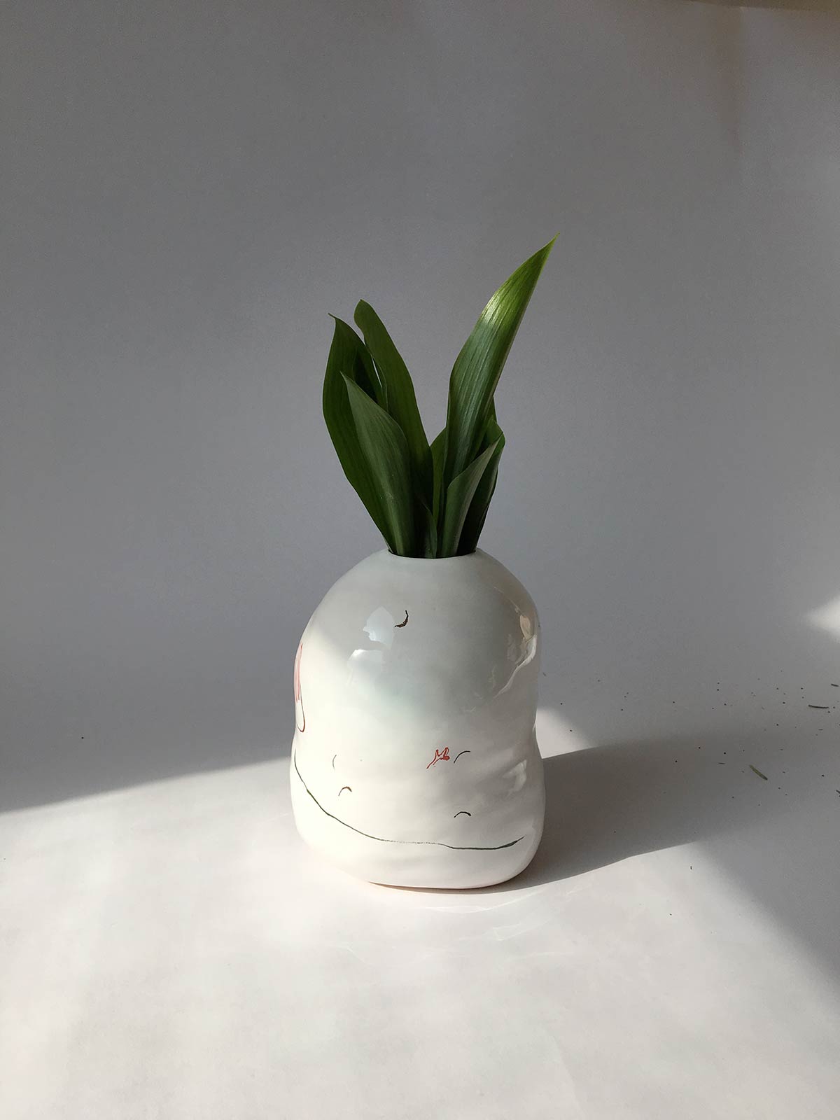 Декоративна ваза для квітів. Виліплена вручну з білої глини і декорована підглазурним розписом. Можна використовувати як самостійний декор для прикраси інтер’єру або як вазу для квітів.