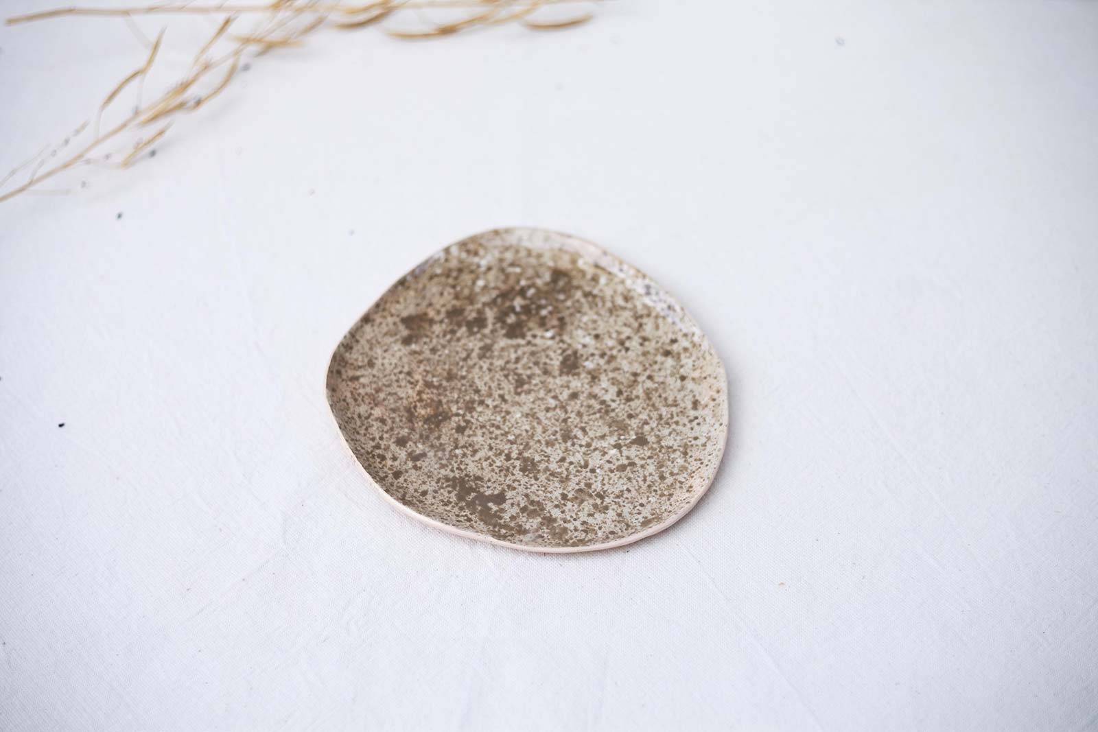 Плоска тарілка з кераміки. Виліплена вручну з білої глини. Можна використовувати як тарілку для десертів або холодних закусок. Виріб можна мити в посудомийній машині і розігрівати в мікрохвильовій печі.