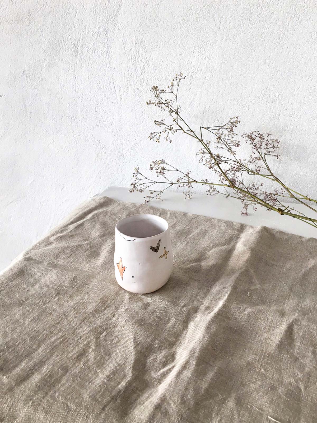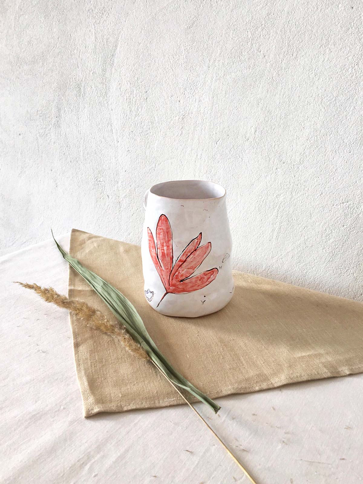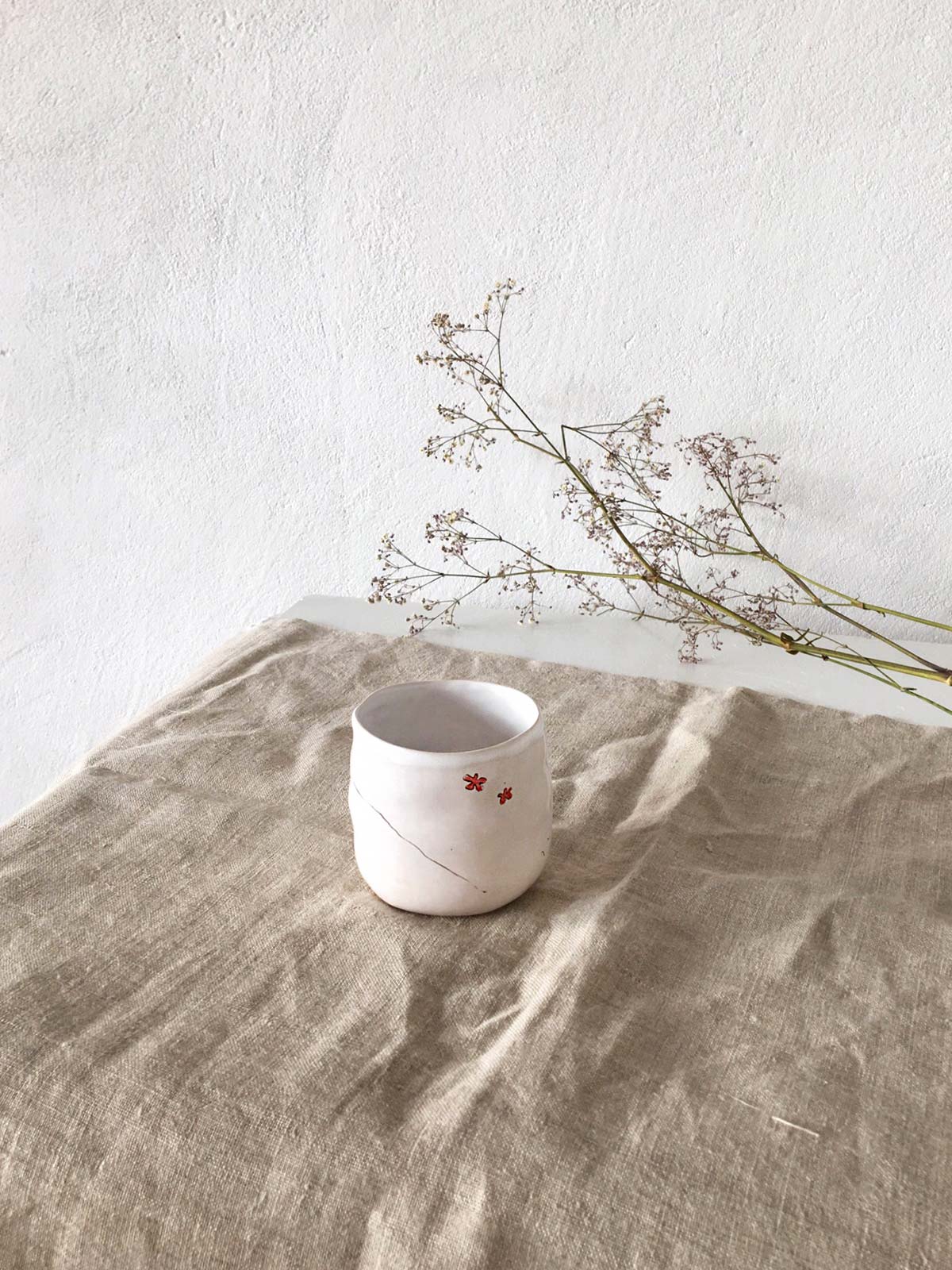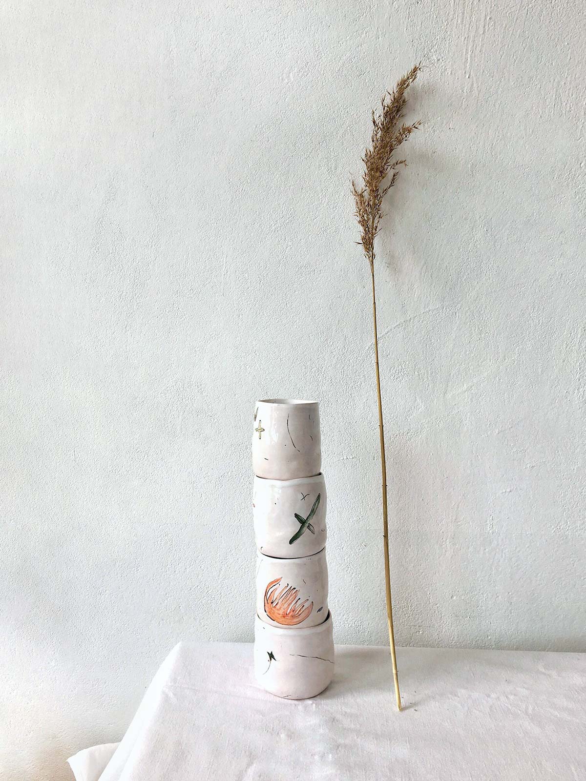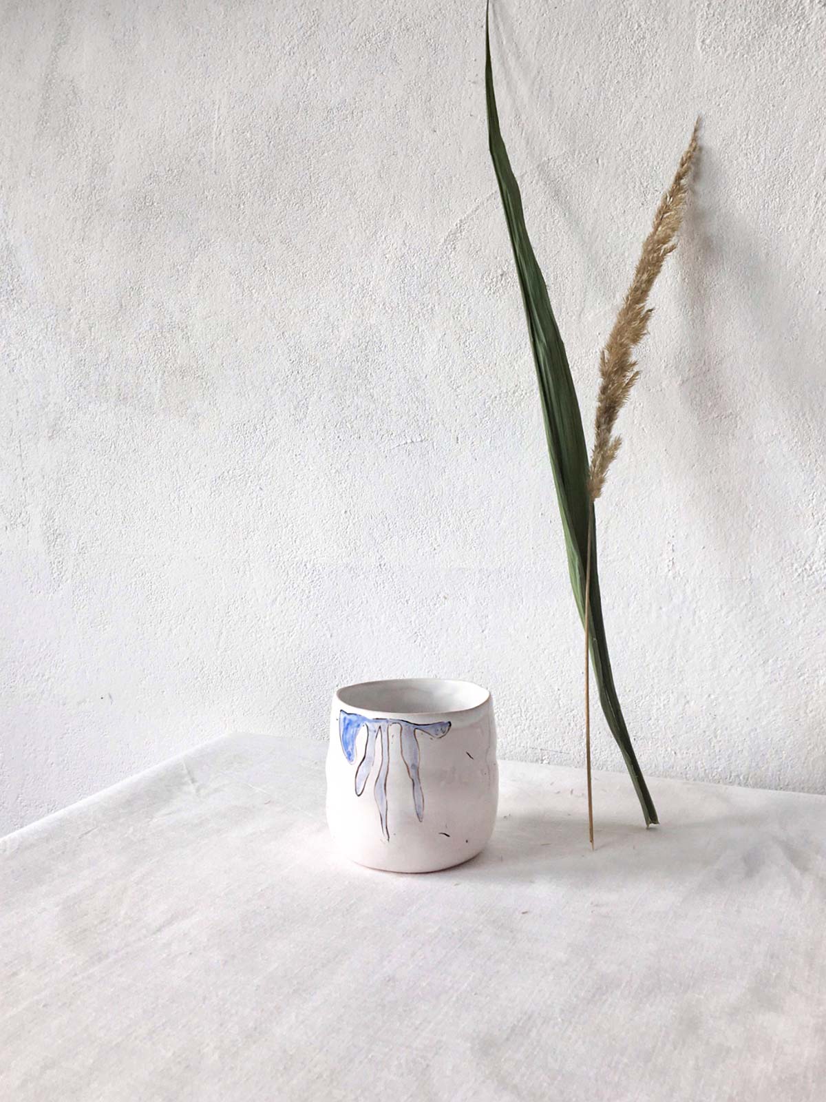 Керамічні склянки і глечик ручної роботи з набору «Дикі квіти». Вироби виліплені вручну з білої глини і декоровані підглазурним розписом. Вироби можна мити в посудомийній машині і розігрівати в мікрохвильовій печі.
