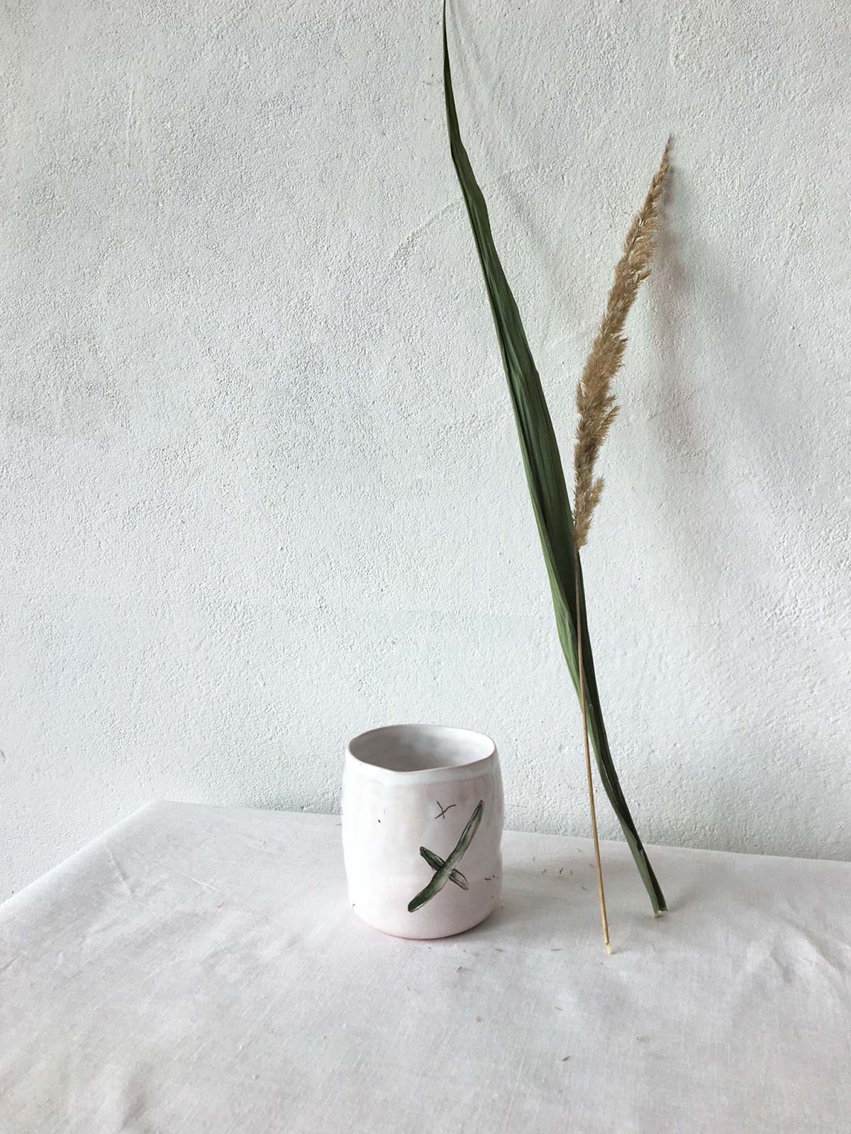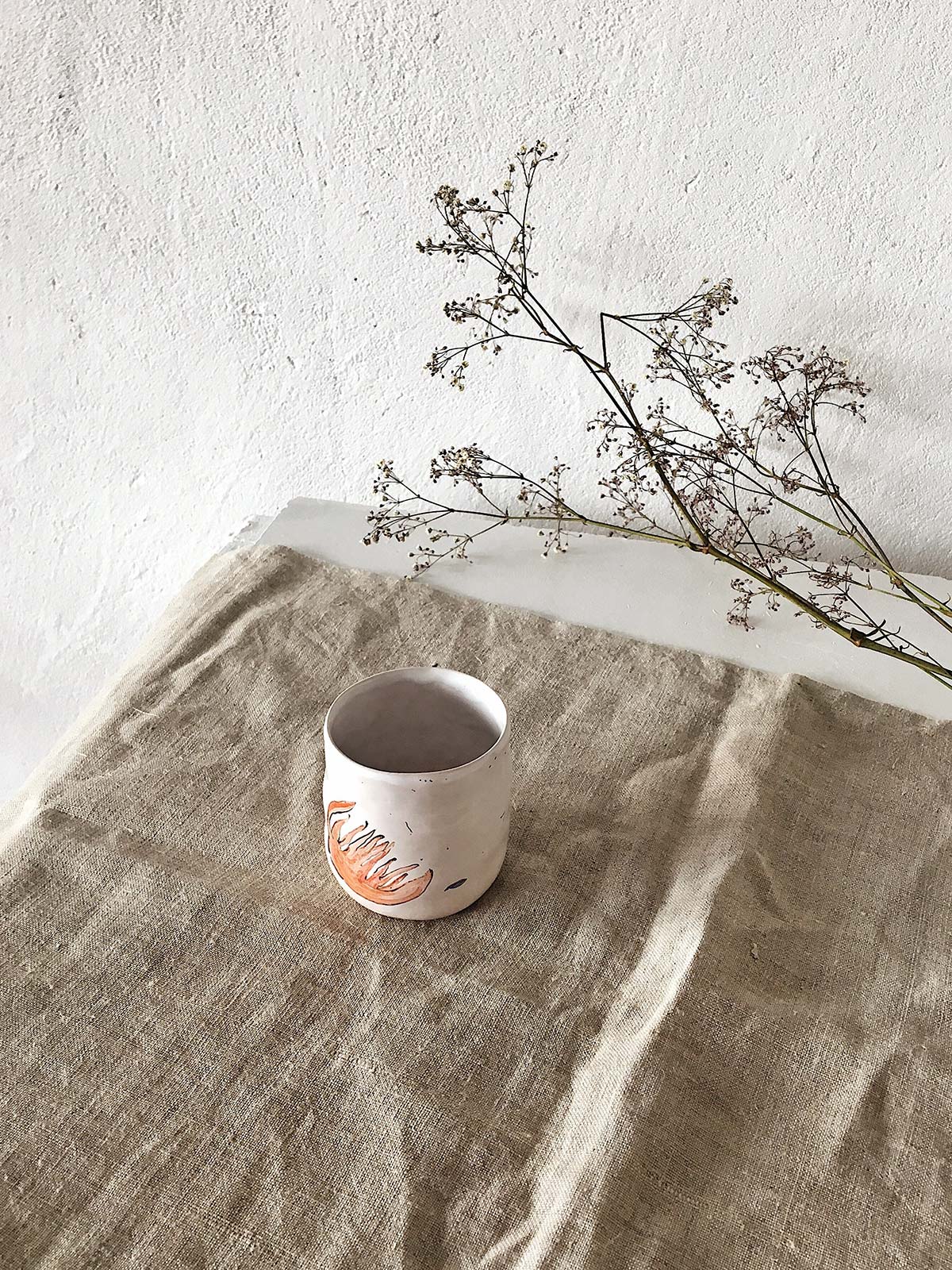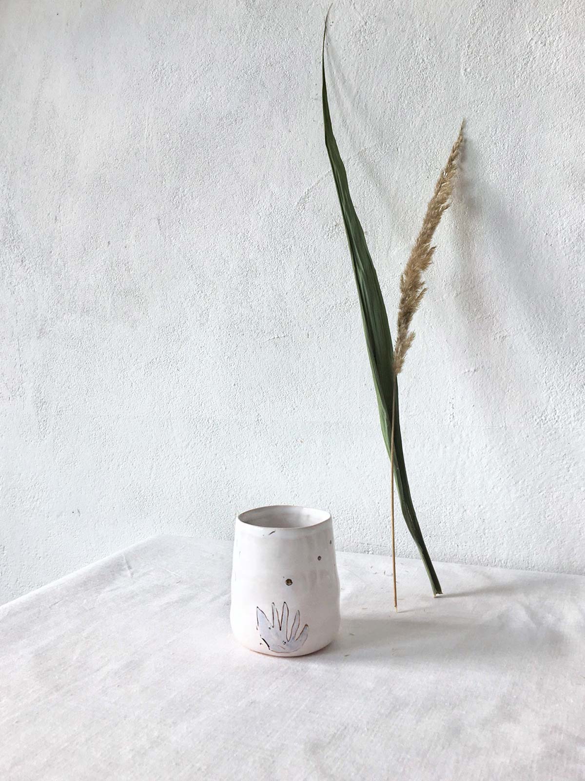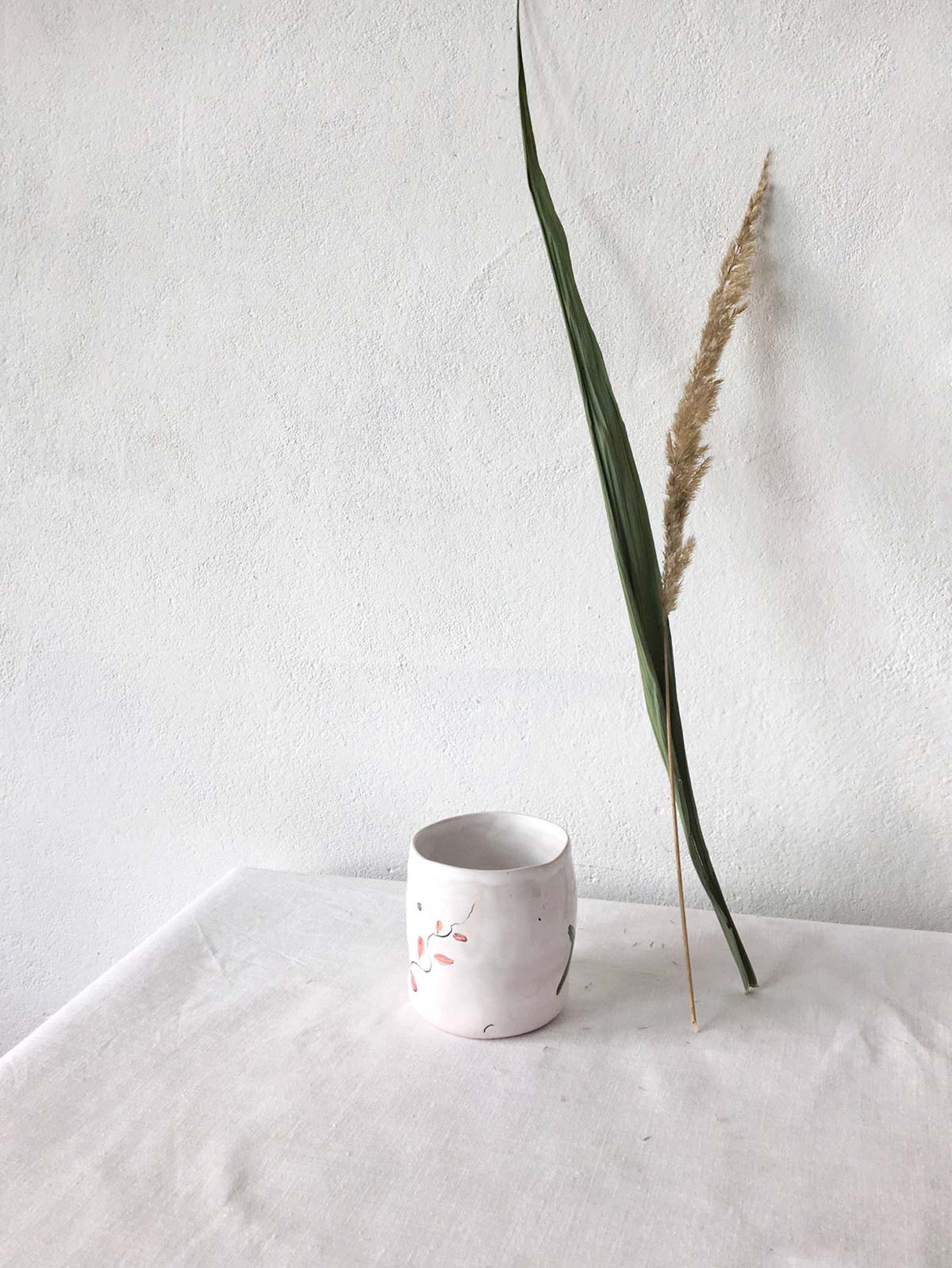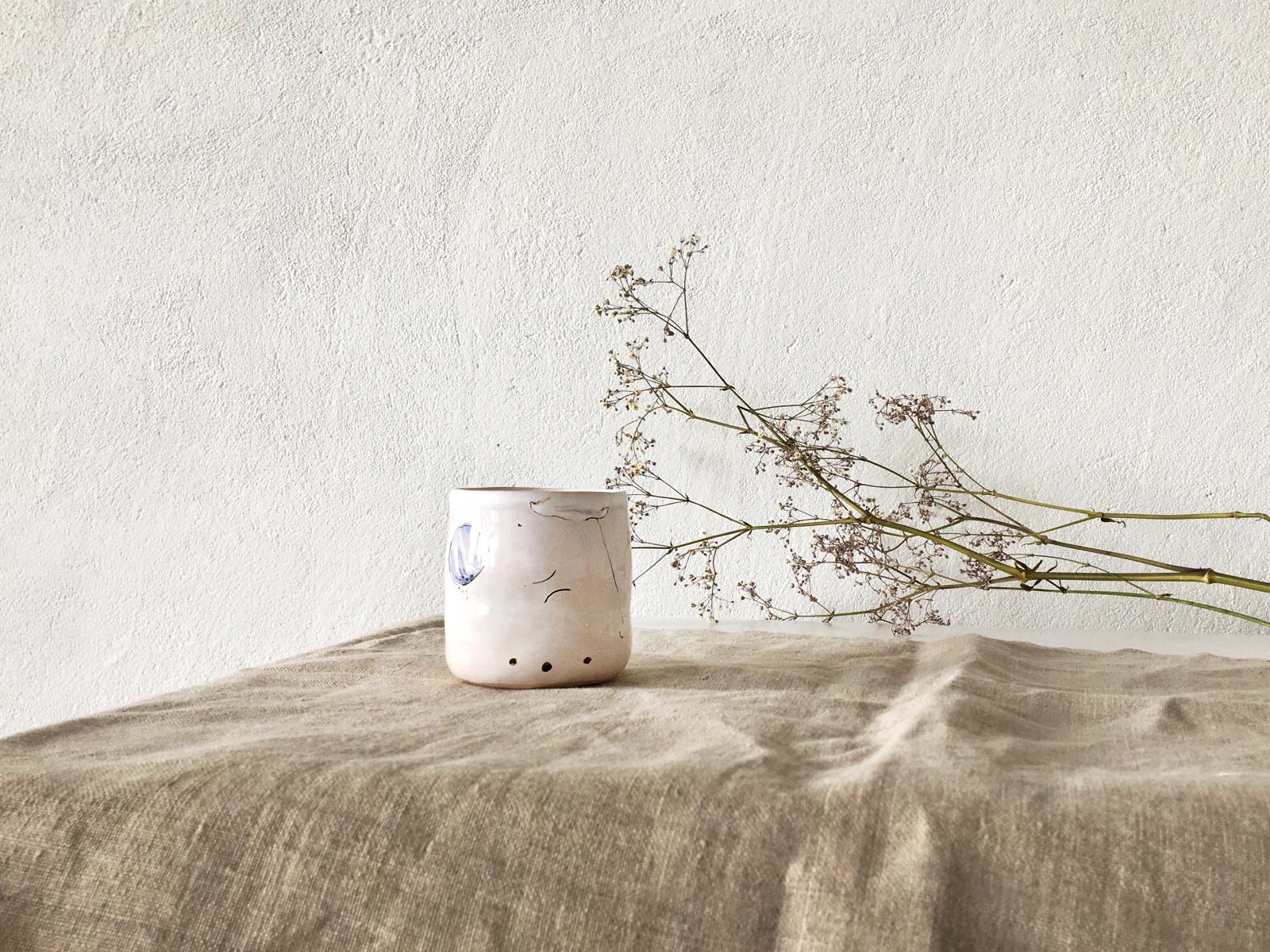 Керамічні склянки і глечик ручної роботи з набору «Дикі квіти». Вироби виліплені вручну з білої глини і декоровані підглазурним розписом. Вироби можна мити в посудомийній машині і розігрівати в мікрохвильовій печі.