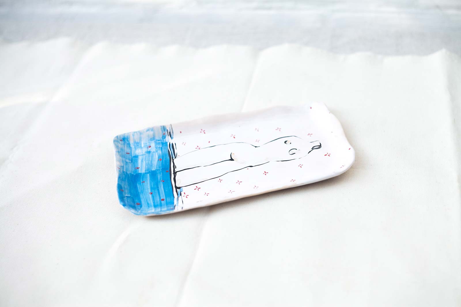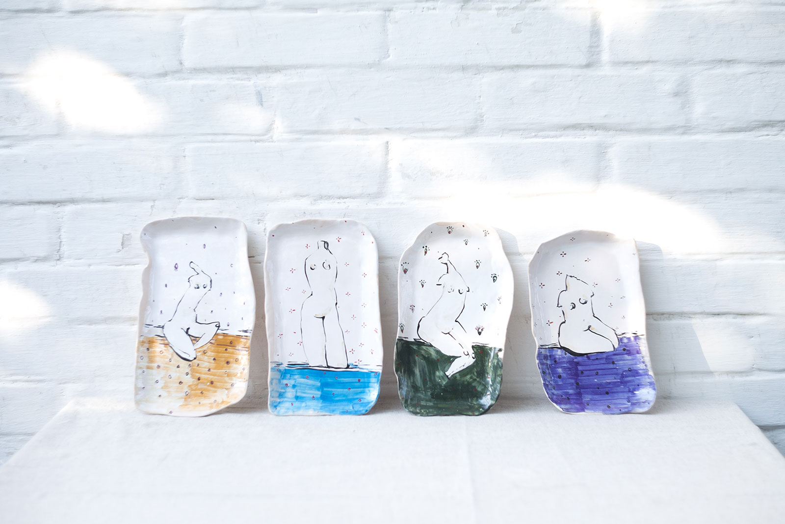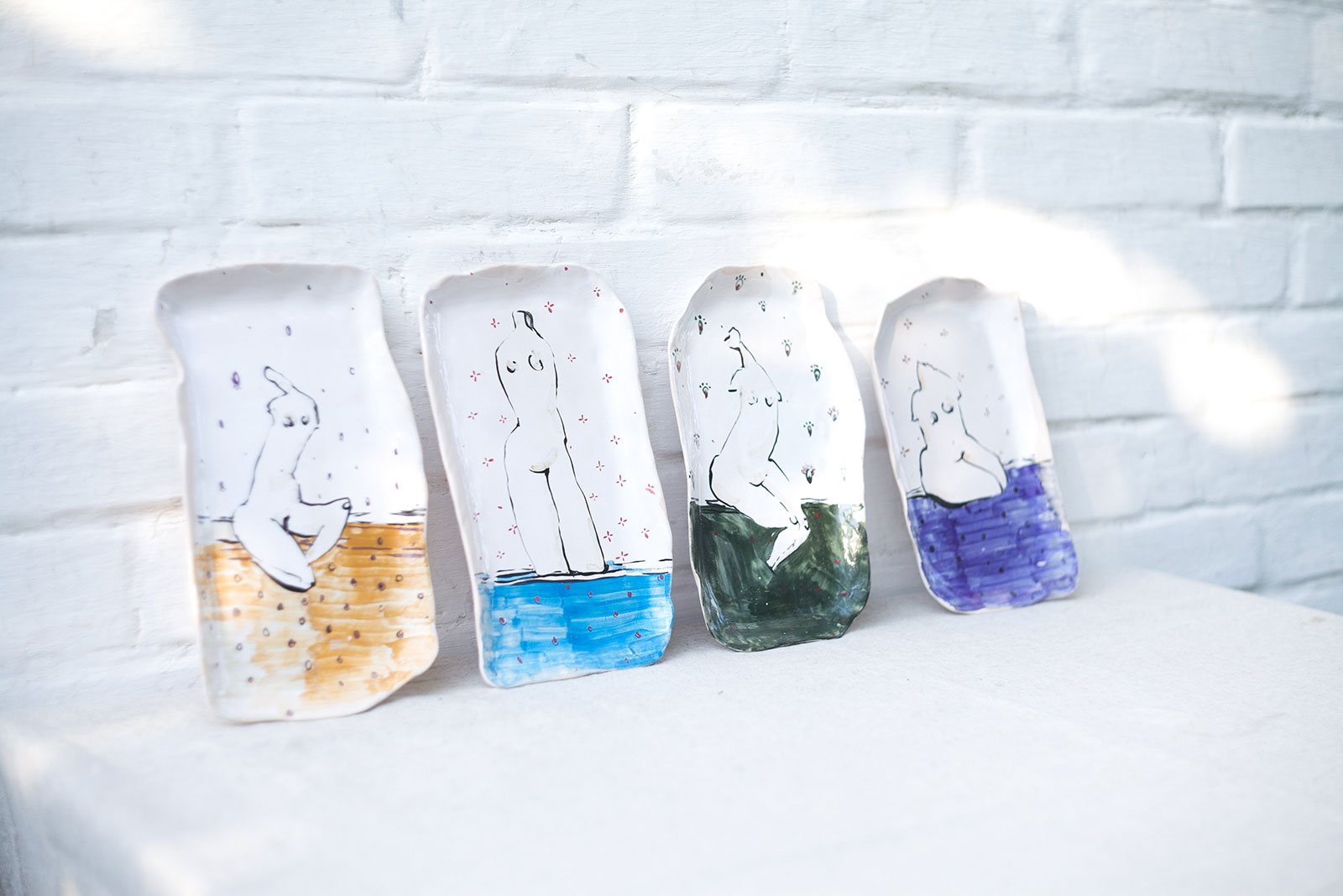 Прямокутні керамічні тарілки ручної роботи з серії «Оголені». Виліплені вручну з білої глини і декоровані підглазурним розписом. Стануть гарною прикрасою інтер’єру або чудовими тарілками для холодних закусок. Вироби можна мити в посудомийній машині і розігрівати в мікрохвильовій печі.