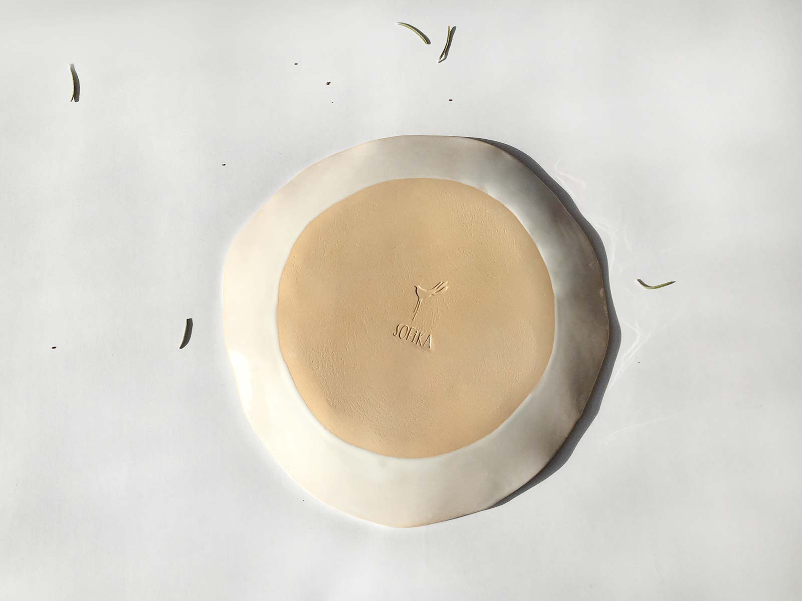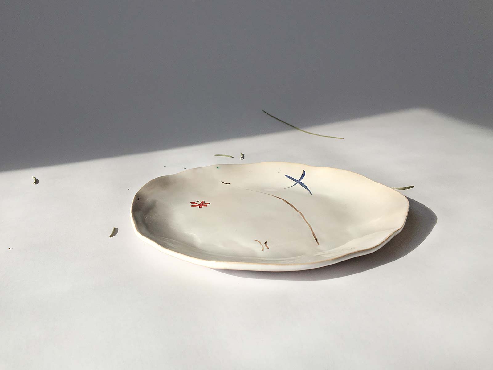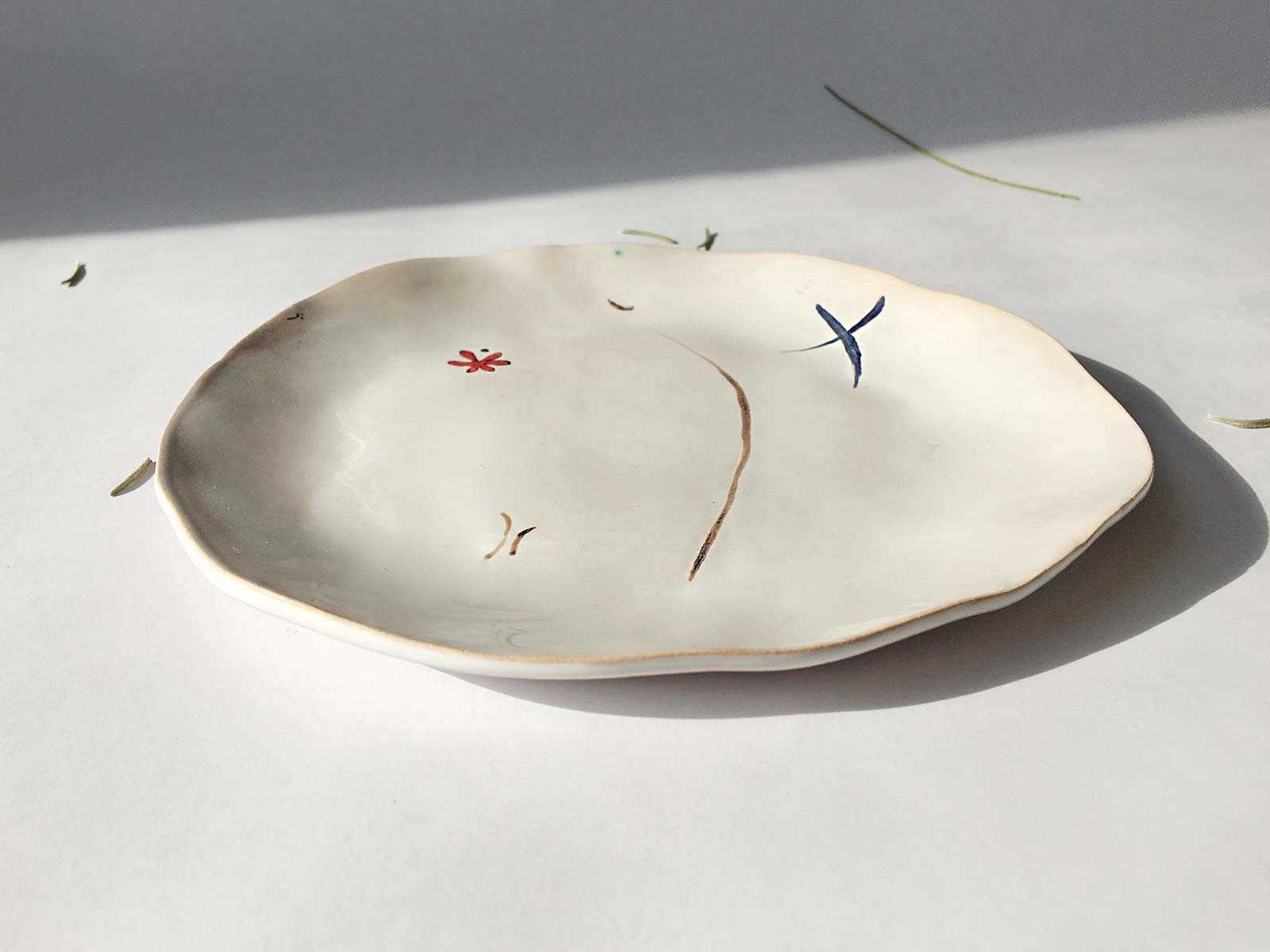 Велика кругла тарілка «Композиція № 3», виліплена вручну з білої глини і декорована підглазурним розписом. Можна використовувати як тарілку для холодних закусок і десертів або як самостійний декор для прикраси інтер’єру. Виріб можна мити в посудомийній машині і розігрівати в мікрохвильовій печі.