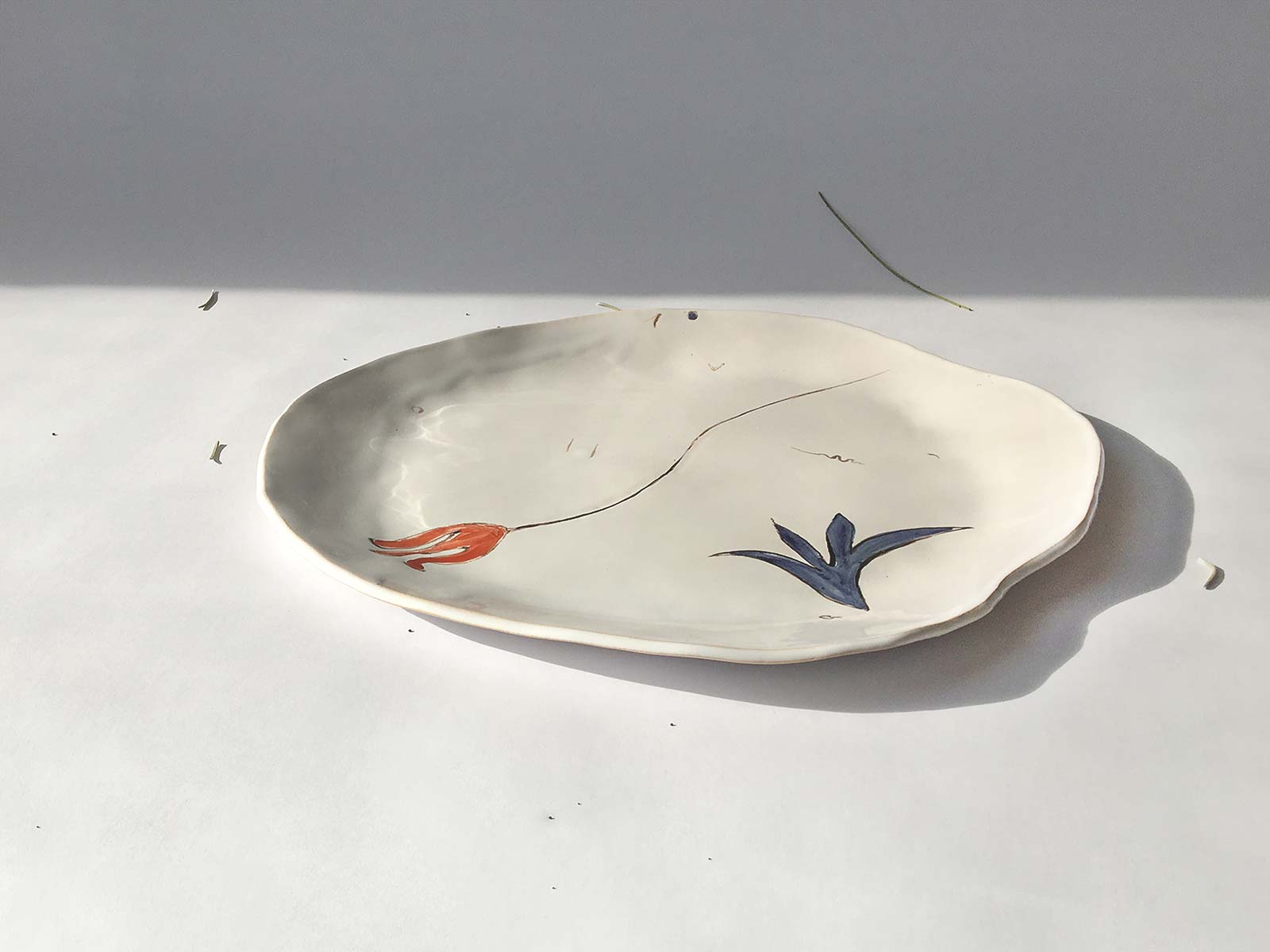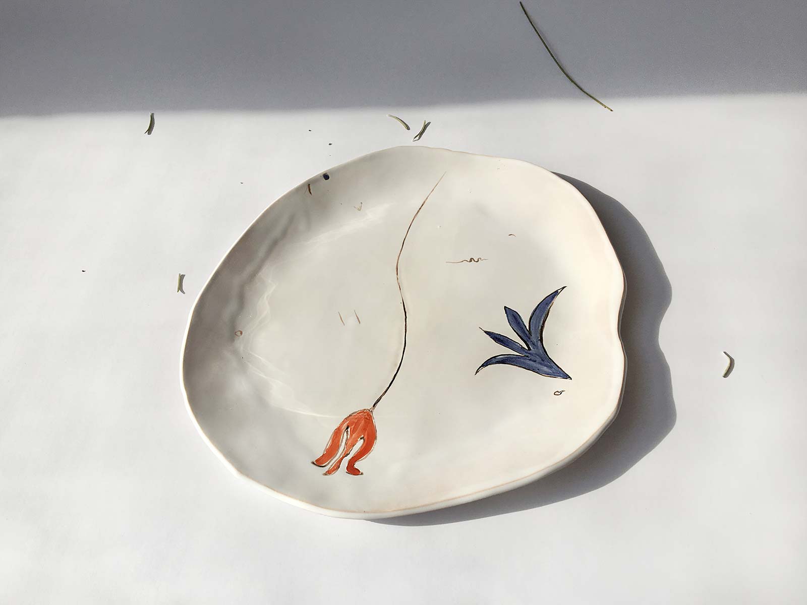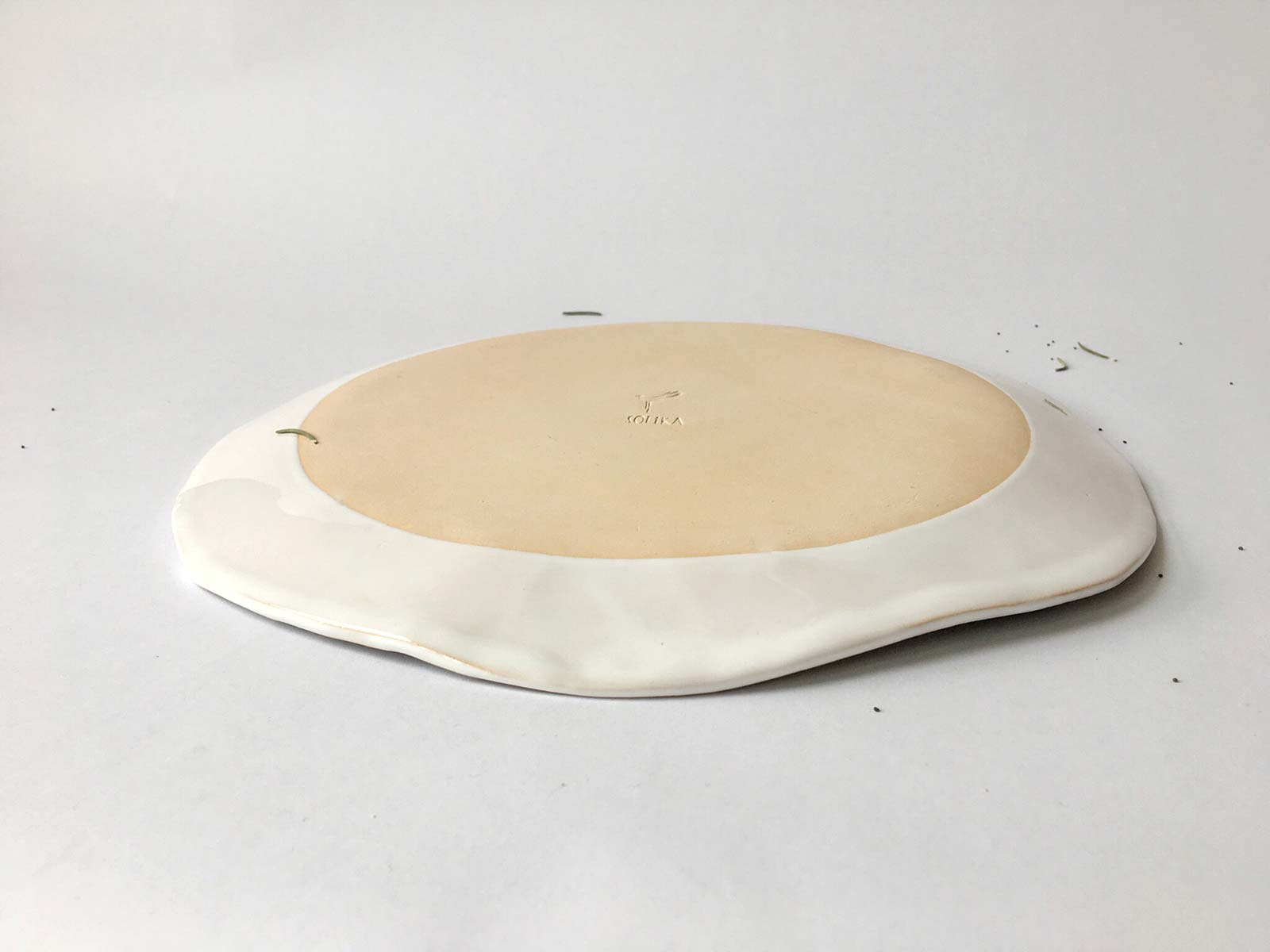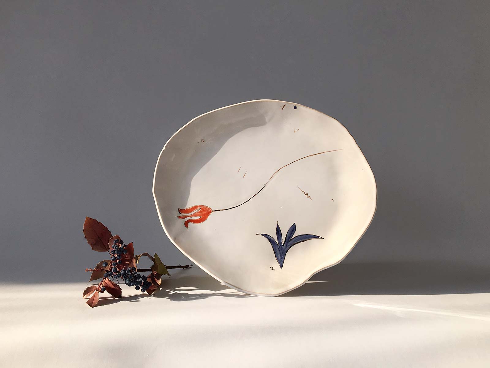 Велика кругла тарілка «Композиція № 4», виліплена вручну з білої глини і декорована підглазурним розписом. Стане гарною прикрасою інтер’єру або чудовою тарілкою для їжі. Виріб можна мити в посудомийній машині і розігрівати в мікрохвильовій печі.