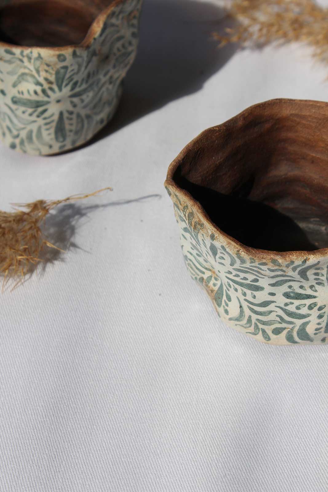 Набір декоративних горщиків для квітів. Вироби виліплені вручну з шамотної глини і декоровані ангобним розписом і молочінням. Знизу мають отвори для стікання води. Набір складається з 3-х виробів. Стануть гарною прикрасою кімнати або чудовими горщиками для квітів.