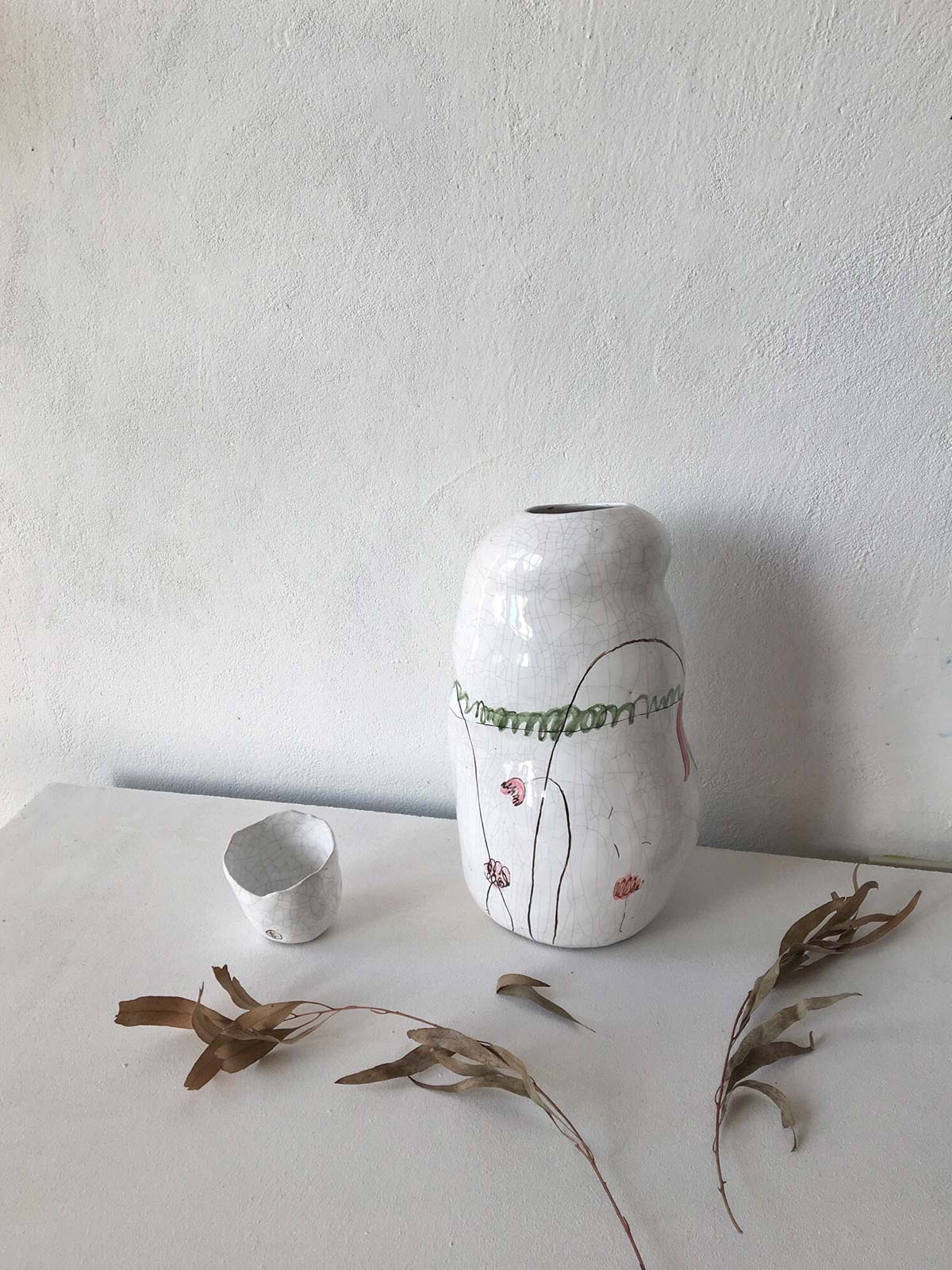 Декоративна ваза для квітів. Виліплена вручну з шамотної глини, декорована підглазурним розписом і молочінням. Можна використовувати як самостійний декор для прикраси інтер’єру або як вазу для квітів.